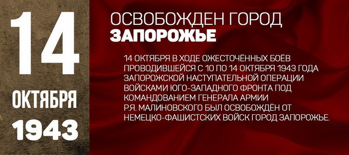 В ходе Запорожской наступательной операции (10-14 октября 1943) войсками Юго-Западного фронта под командованием генерала армии Р.Я. Малиновского был освобождён от немецко-фашистских войск город Запорожье.