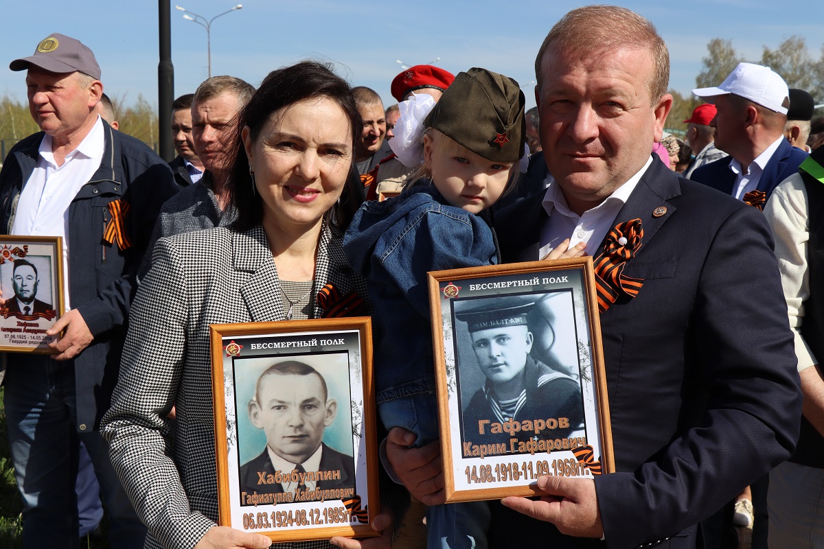 В акции приняли участие глава Дрожжановского муниципального района Марат Гафаров с супругой и дочкой, руководители и сотрудники организаций, предприятий района, жители района. Все на своих руках несли портреты своих родных: отцов и дедов, прадедов, братьев, женщин матерей и бабушек, которые воевали в Великой Отечественной войне.