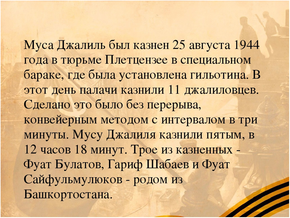 Мусу Джалиля гильотинировали в военной тюрьме Плётцензее в Берлине.
