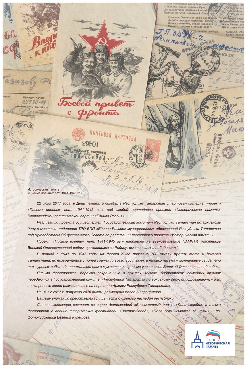 Цель проекта: сохранить достоверную память о минувших событиях и об истории родного края, о людях. В основу выставки легли письма с фронта, бережно сохранённые жителями Республики и переданные ими в Госархив РТ. Письма печатались без изменений. Фоном для писем послужили фотоработы Евгения Кулешова, выполненные во время военно-исторических реконструкций разных лет. А так же в экспозицию вошли его фотографии с марша «Бессмертный полк, «День скорби», 9 мая и др.