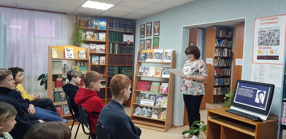 12 января.в Урсалинской библиотеке прошел военно-исторический час, посвященный генералу Панфилову И.В. Участники мероприятия познакомились с биографией легендарного генерала-майора Ивана Панфилова. Иван Васильевич – выдающийся советский военачальник, участник Гражданской и Великой Отечественной войны, Герой Советского Союза. Учащимся СОШ Урсалы рассказали о подвиге 28 героев-панфиловцев под Москвой у разъезда Дубосеково. Подвиг 28 панфиловцев - образ беспримерного героизма, бесстрашия и несгибаемой смелости. Это символ великого самопожертвования ради спасения Родины, ради победы над врагом.