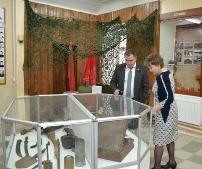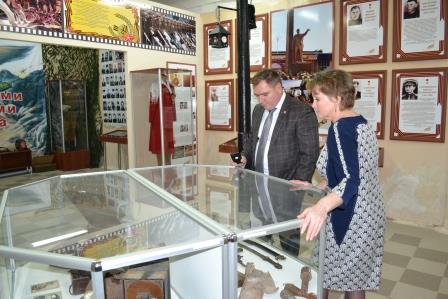 Директор музея Елена Мещерякова рассказала главе района о работе коллектива по патриотическому воспитанию, ознакомила с обновленной экспозицией зала. Валерий Чершинцев принимает активное участие в работе музея, в качестве дарителя содействует пополнению музейных фондов. Так, в витрине с предметами оружия выставлен макет автомата ППШ, переданный им в дар музею.