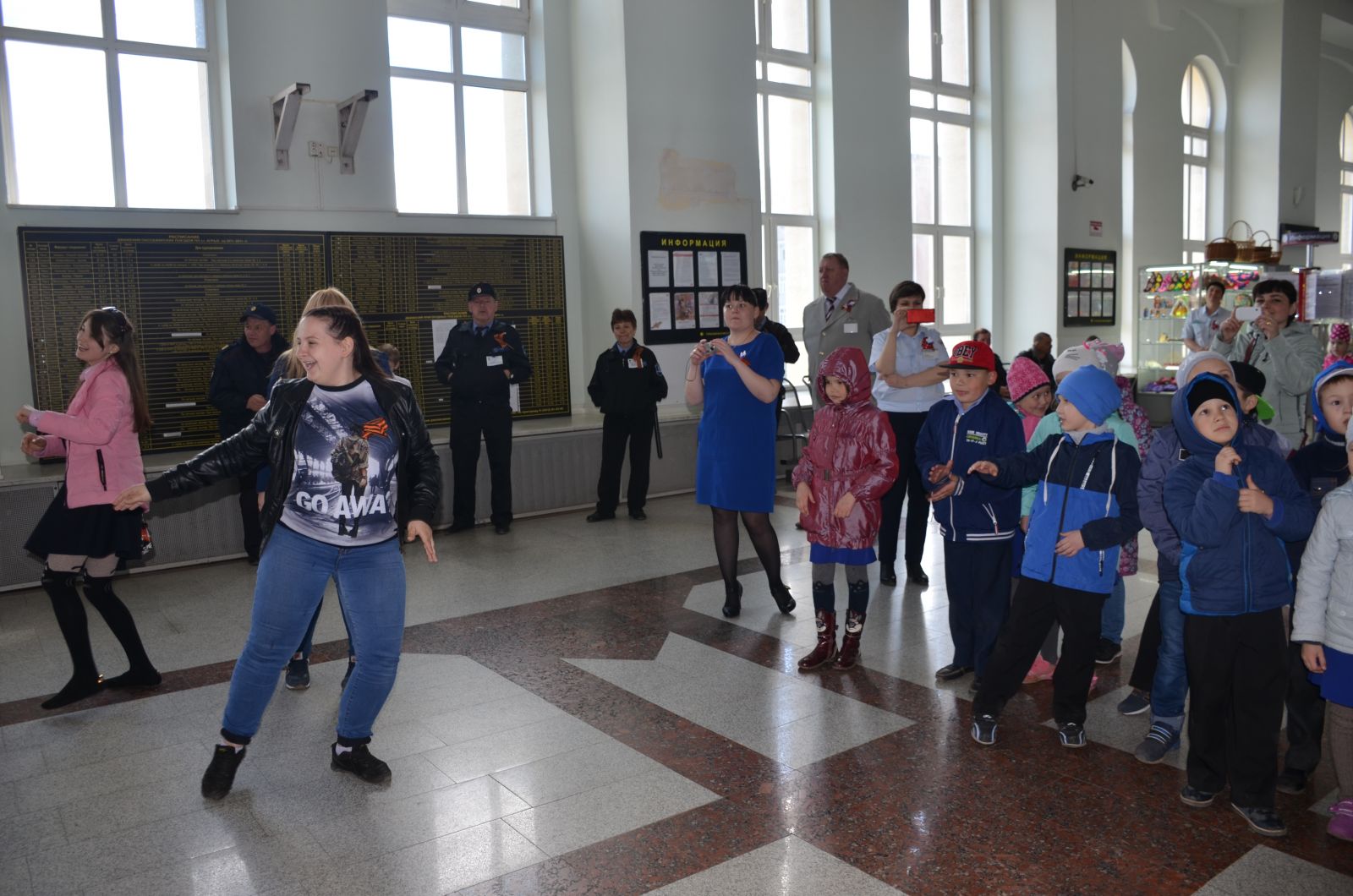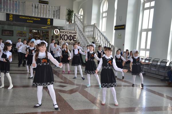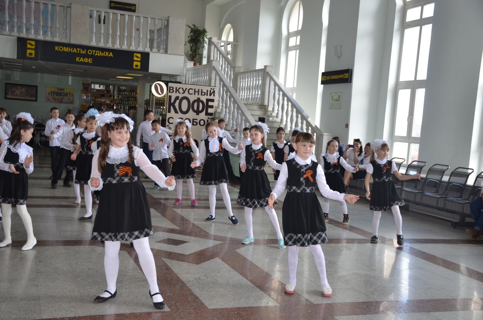 В зале ожидания ученики школы №3 протанцевали перед пассажирами праздничный флеш-моб. Их поддержали друзья и учащиеся школы №4, филиала №2 Государственного автономного профессионального образовательного учреждения «Нижнекамский агропромышленный колледж».