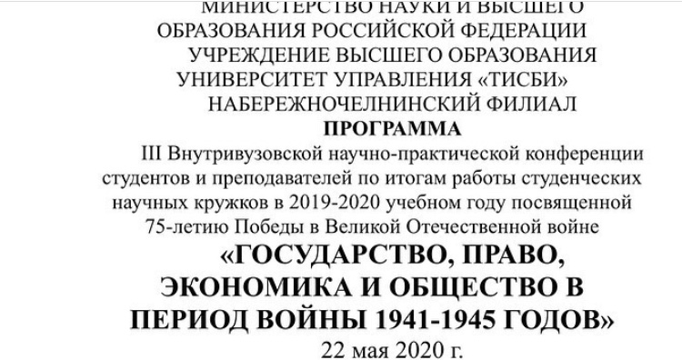 В Набережночелнинском филиале университета управления "ТИСБИ" на этапе завершения учебного процесса провели III внутривузовскую научно-практическую конференцию студентов и преподавателей по итогам работы студенческих научных кружков. В 2019-2020 учебном году данное мероприятие посвятили 75-летию Победы в Великой Отечественной войне "Государство, право, экономика и общество в период войны 1941-1945 годов". На пленарном заседании с приветсвенным словом к участникам обратился проректор по научной работе Университета управления "ТИСБИ" (г.Казань), профессор Грязнов А.Н. доктор психологических наук, полковник в отставке. Заслушаны доклады ученых филиала охватывающие исторические, экономические и юридические аспекты периода Великой Отечественной войны. В пяти секциях 49 студентов выступили с докладами по теме конференции.