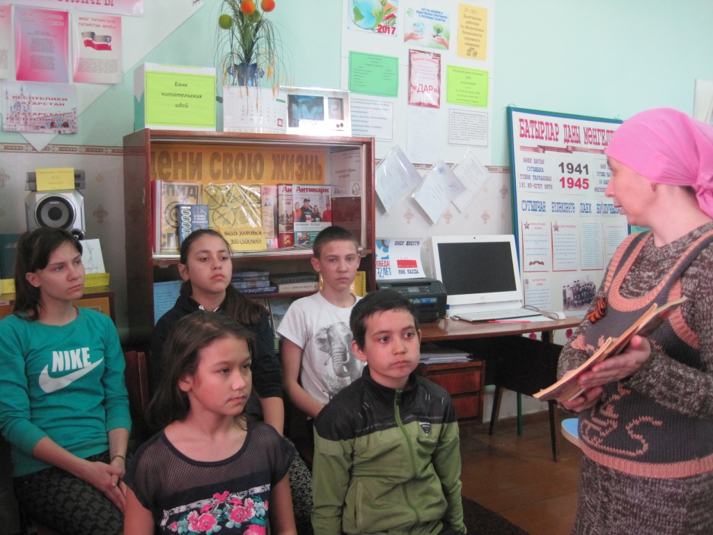 29 апреля в Нижнетарханской поселенческой библиотеке прошли громкие чтения «Детям о войне». Мероприятие началось с минуты молчания, посвященной детям войны, тем детям, чье детство сжигали, расстреливали, убивали. Убивали бомбой и пулями, голодом, страхом. Ведущий библиотекарь Гузель Шамсутдинова прочла ребятам стихотворения военного времени - «Жди меня» К. Симонова и «Могила неизвестного солдата» Э. Асадова. Заведующая сельским клубом Минзифа Галиуллова рассказала о подвигах в годы войны их ровесников: Вали Котика, Зины Портновой, Лёни Голикова, Марата Казея, которые были посмертно удостоены звания Героя Советского Союза. Затем ребята сами по очереди прочли книгу «Дети – герои Великой Отечественной войны», где более подробно узнали о героических подвигах детей в годы Великой Отечественной войны.