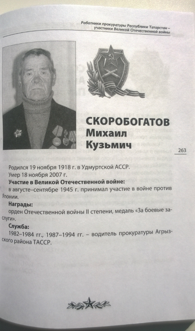 Прокуратурой Агрызского района были собраны и направлены в прокуратуру Республики Татарстан сведения об участнике Великой Отечественной войны – водителе прокуратуры Агрызского района ТАССР Скоробогатове Михаиле Кузьмиче.