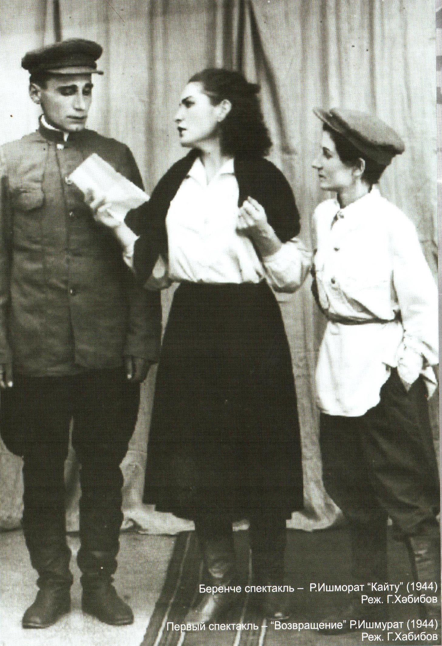 Премьера первого спектакля состоялась в конце мая 1944 года. Это была драма Ризы Ишмуратова «Кайту» («Возвращение»). В спектакле участвовало восемь человек: директор и художественный руководитель театра (режиссёра тогда ещё не было) Асман Галиев, артисты Нагима Давлетшина, Тагира Яббарова, Гибат Хабипов, Нагима Кимова, Ханифа Ихсанова, Сания Хабипова. Главную роль – раненого красноармейца Хамита – исполнял А. Галиев. Другая главная роль – председателя колхоза Муршиды – была исполнена художественным руководителем РДК Н. Давлетшиной. В роли матери Хамита выступила бывшая артистка передвижного театра Т. Яббарова. Актриса из Астрахани Н. Кимова и участницы небольших концертных групп С. Хабипова и Х. Ихсанова, казанец Г. Хабипов и др. Театр тогда, конечно, больше походил на драматический кружок. Почти никто из его актёров не имел театрального образования. Труппа полностью держалась на энтузиазме актёров, если не считать скромного тылового пайка.