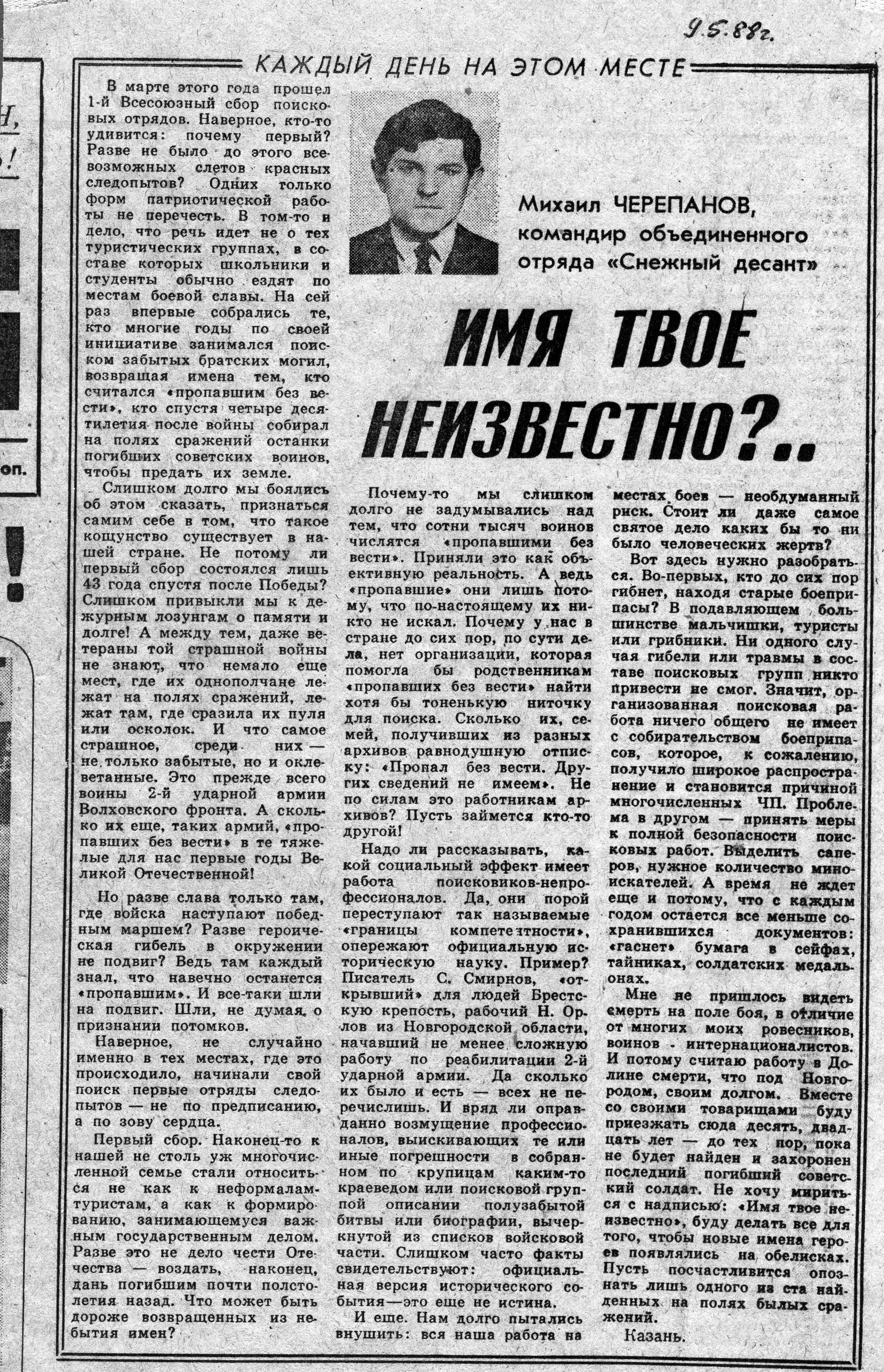 М. Ч.: Нет, ты вот просто фразу прочитай, это всесоюзная газета, самая многотиражная была. «Наверное, кто-то удивится — почему первый съезд? Разве не было до этого всевозможных слетов красных следопытов? На сей раз впервые собрались те, кто многие годы по своей инициативе занимался поиском забытых братских могил, возвращая имена тем, кто считался пропавшим. Слишком долго мы боялись об этом сказать, признаться самим себе в том, что такое кощунство существует в нашей стране. Не потому ли первый сбор состоялся лишь 43 года спустя после Победы?» То есть я тут открыто впервые это все сказал. Понимаешь, в чем дело — нам не разрешали даже 2-ю ударную упоминать. У меня вычеркивали из статьи упоминания 2-й ударной, центр вычеркивал. То есть это не принято было — в «Коммунисте Татарии» запрещены были даже упоминания этого.