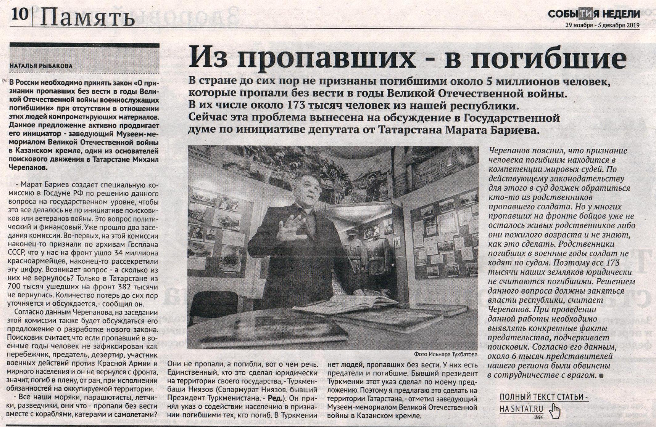 В стране до сих пор не признаны погибшими около 5 миллионов человек, которые пропали без вести в годы Великой Отечественной войны. В их числе около 173 тысяч человек из нашей республики. Сейчас эта проблема вынесена на обсуждение в Государственной думе по инициативе депутата от Татарстана Марата Бариева.