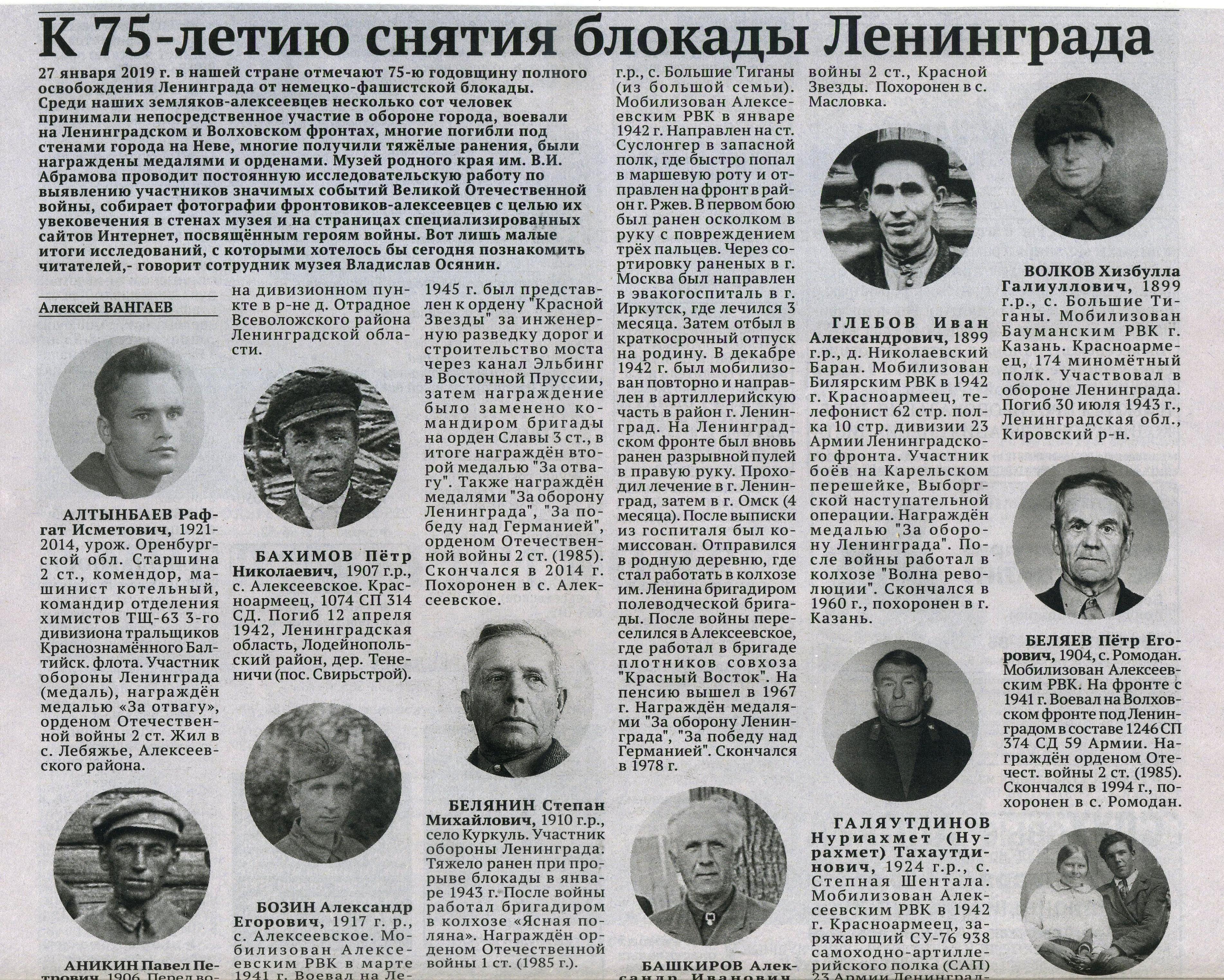 25 января 2019 г., к 75-й годовщине окончательного и полного освобождения Ленинграда от немецко-фашистской блокады, Алексеевская районная газета "Заря" опубликовала статью о некоторых результатах исследовательской работы Музея родного края о земляках-алексеевцах непосредствнных участников обороны Ленинграда. В статье представлена лишь малая доля накопленного исследовательского материала о героях битвы за город на Неве, который мы используем для проведения временных выставок, занятий со школьниками.