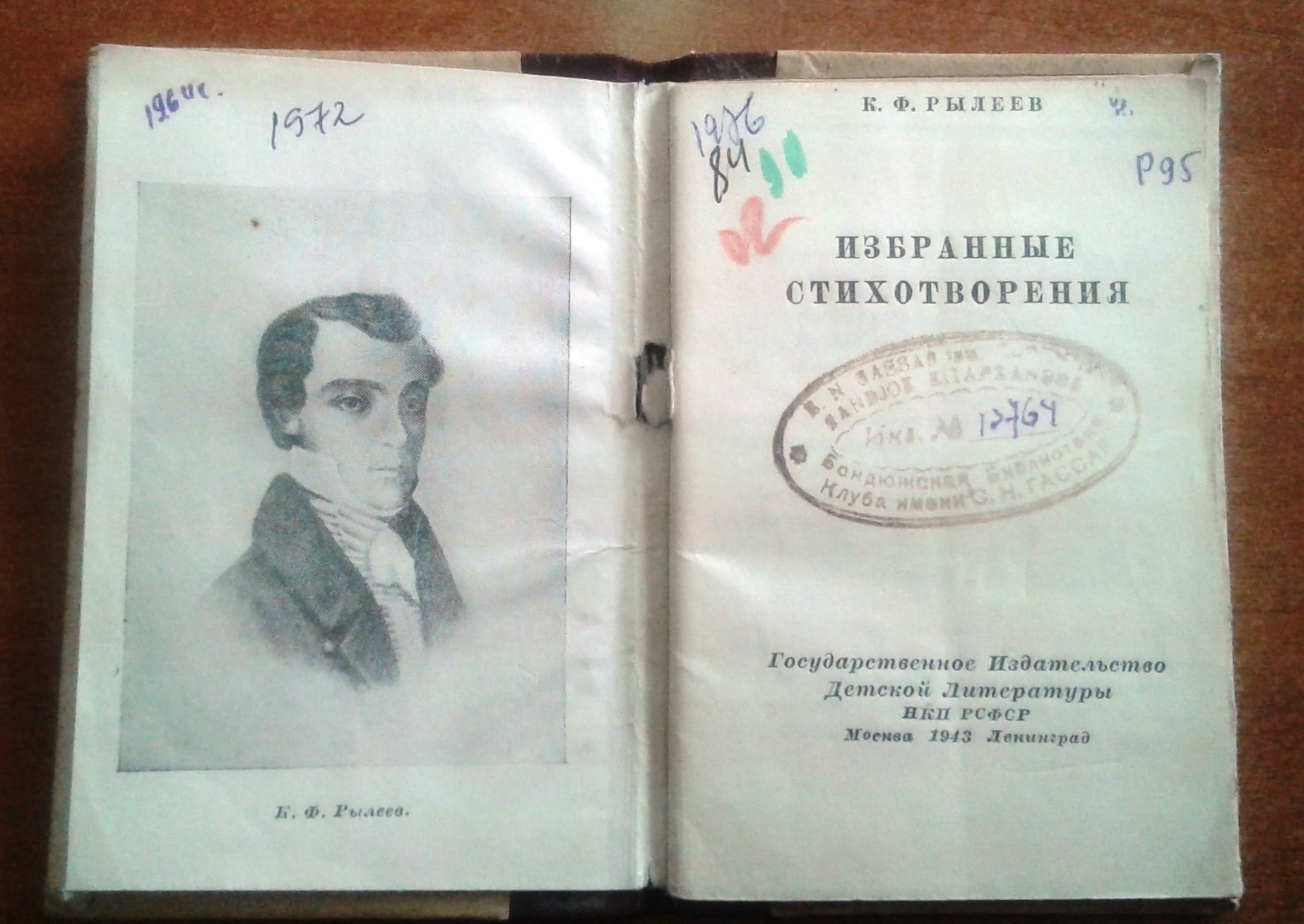 В фондах краеведческого музея есть книга К.Ф.Рылеева «Избранные стихотворения», изданная в 1943 г. Государственным Издательством Детской Литературы.