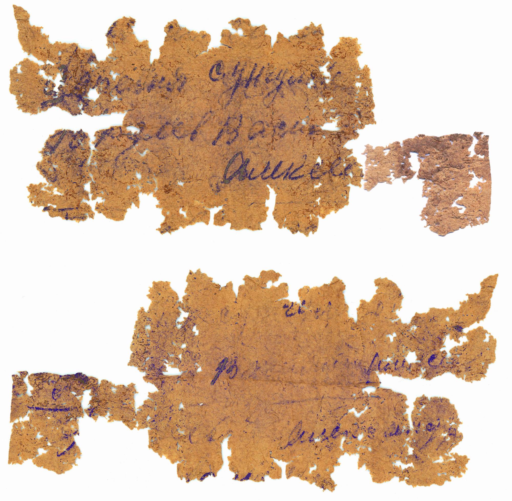 Взято с сайта "Объединение "Отечество" РТ": http://отечестворт.рф/news/2020/033_medalyony.html: " Второй медальон оказался сложнее, с нестандартной запиской, бумага сначала сложена вдоль, потом поперек, потом свернута, засунута в капсулу с кручением и смята об дно капсулы. Да и окружающая среда оказала на нее более агрессивное воздействие. Но повезло, что бумага в середине скрутки сохранилась лучше, из нескольких кусочков удалось собрать и сложить ее среднюю часть, а компьютерной обработкой прочитать написанный на ней текст.