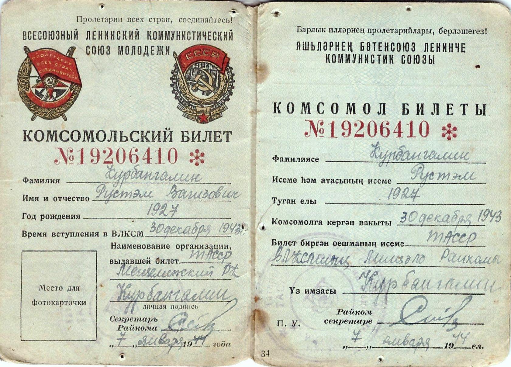 Комсомольский билет Курбангалина Р.В. 30 декабря 1943 года. КП-602. Комсомольский билет Курбангалина Р.В. 30 декабря 1943 года. Опубликовано 28 мая, 2020 - 17:04 пользователем НМ РТ