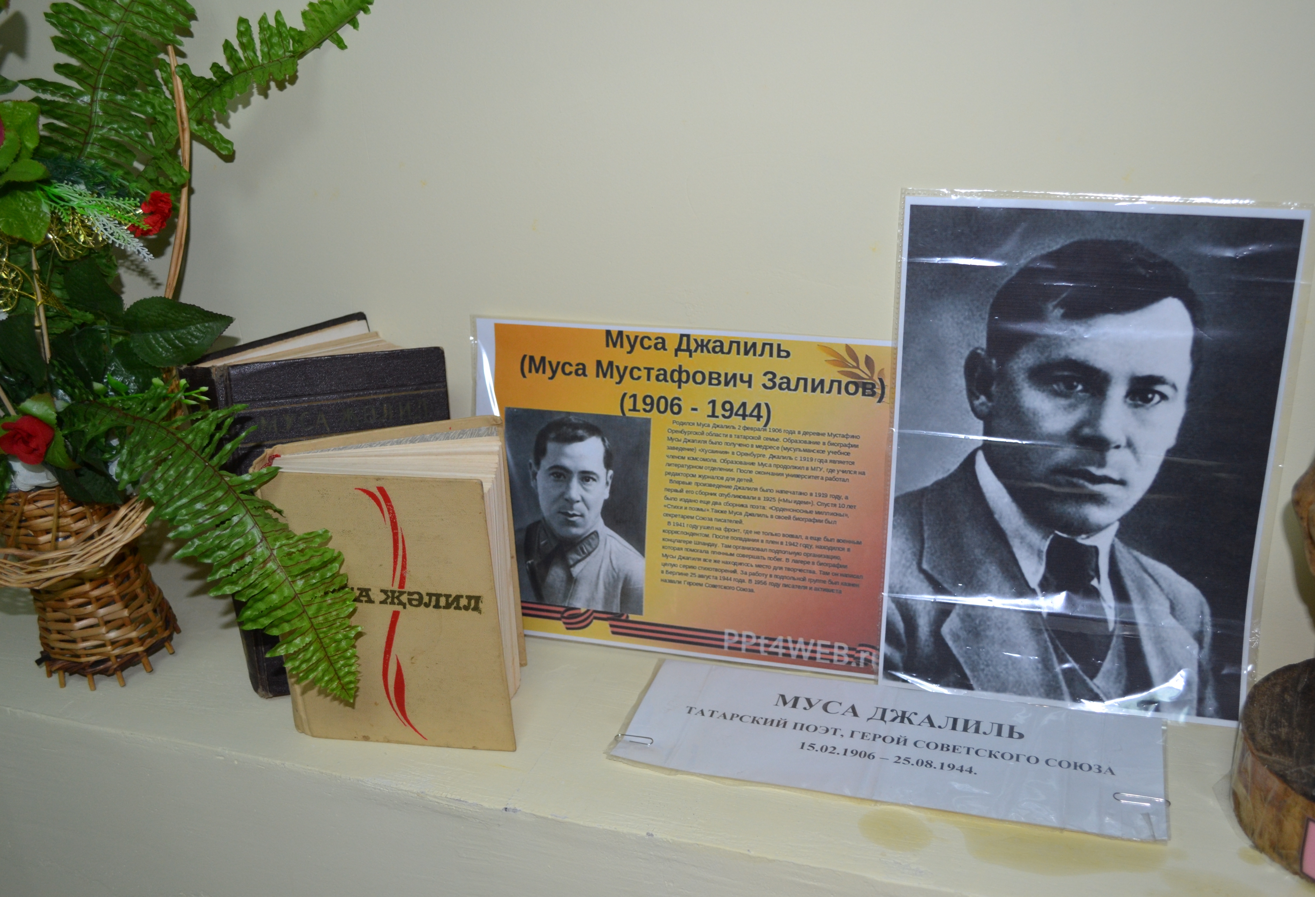 Муса Джалиль прожил короткую жизнь, но память о нем, о его творчестве, мужестве и героизме останется в народе навсегда. В 16 лет он начал писать свои первые стихи, призывающие рабочую молодежь на борьбу с врагами революции. Когда началась война, Джалиль ушел на фронт. 26 июня 1942 года в бессознательном состоянии попал в плен. В том же году гитлеровцы начали формирование так называемых национальных легионов, целью которых было создание отрядов из нерусского населения СССР для борьбы против Советского режима. В такую группу попал и Джалиль. В ней он организовал подпольный отряд, вел антигитлеровскую агитацию, распространял листовки, готовил восстания. Но среди них оказался предатель, и вся группа 25 августа 1944 года была казнена. К сожалению, в то время каждый, кто попадал в плен, считался предателем и изменником Родины. Так случилось и с М. Джалилем. Спустя годы после войны стало известно о его подвиге. Будучи приговоренным к смертной казни он написал сборник стихов «Моабитские тетради». В них тоска по Родине, тяжесть одиночества. Но в то же время спокойная и стойкая уверенность в победе. Благодаря кропотливому поиску следопытов была установлена его трагическая гибель, 2 февраля 1956 года за исключительную стойкость и мужество, проявленные в борьбе с немецко-фашистскими захватчиками Мусе Джалилю посмертно было присвоено звание Героя Советского Союза.