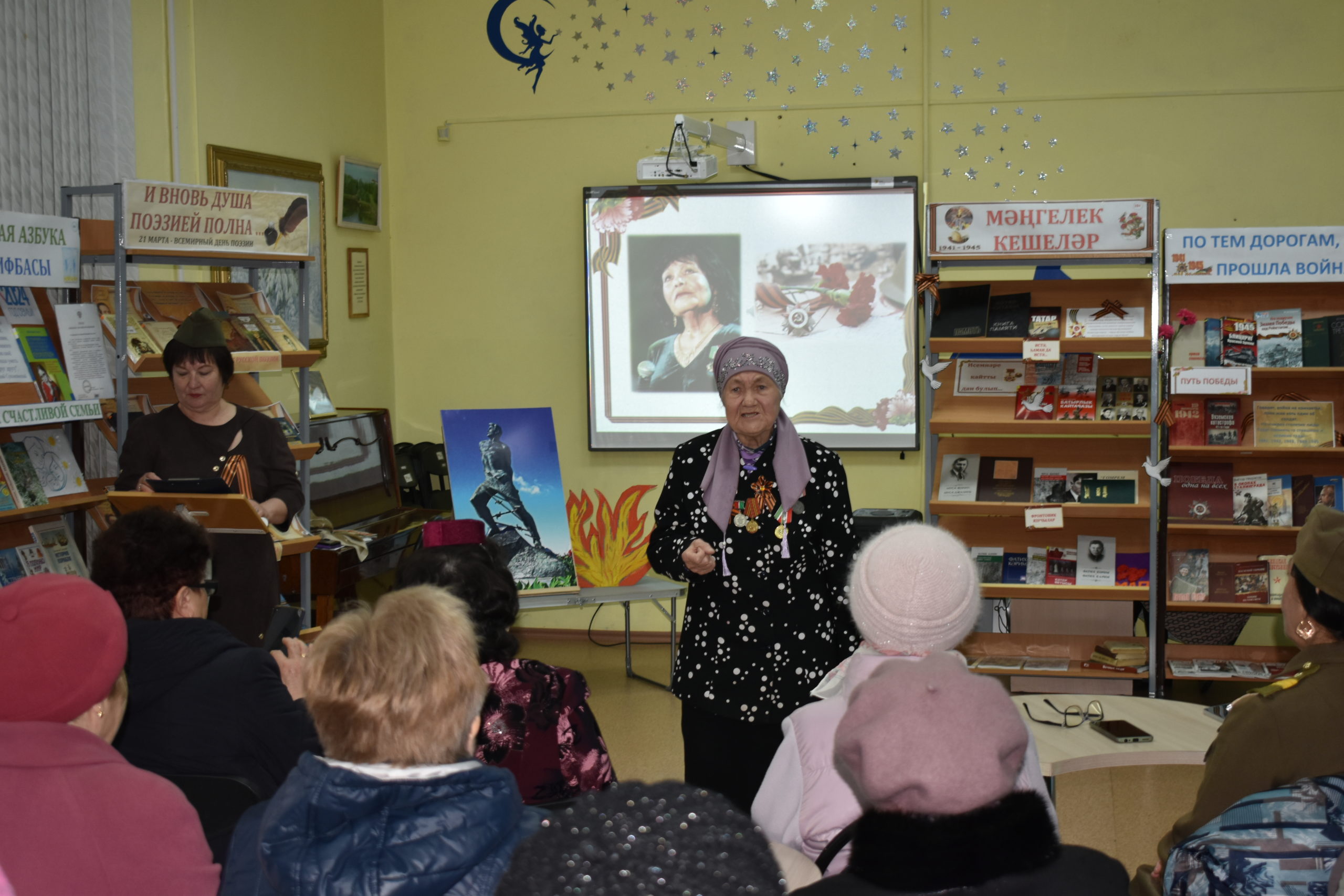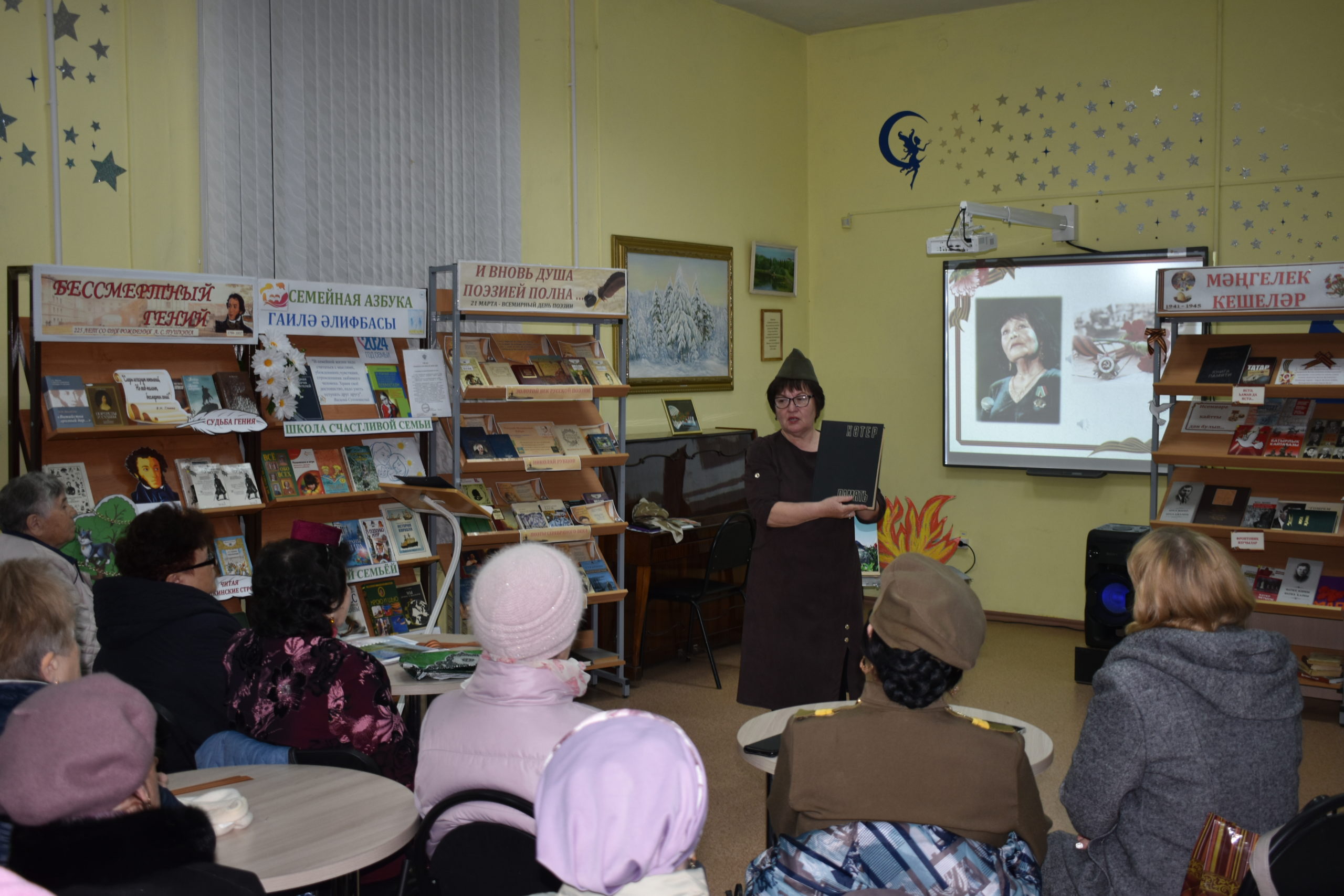 В преддверии праздника Дня Победы сотрудники центральной библиотеки провели для участников клуба «Илһам чишмәләре» литературно-музыкальный вечер «И пусть поколения помнят». Библиотекарь рассказала присутствующим о страшном дне начала Великой Отечественной войны, о мужестве и героизме нашего народа, проявленного в эти годы, о том, какой ценой досталась победа над немецко-фашистскими захватчиками, бесстрашии и стойкости защитников Родины. Гости мероприятия вспомнили имена известных поэтов и писателей периода Великой Отечественной войны, прослушали аудиозаписи стихотворения Фатиха Карима «Кыңгыраулы яшел гармун» в исполнении литературоведа Фоата Галимуллина, посмотрели видеозаписи песен в исполнении известных татарских певцов: «Солдатлар», «Син кайтмадың». Участники вечера рассказали о своих отцах, родственниках, которые были участниками Великой Отечественной войны, показали фотографии и медали, поделились воспоминаниями о тех страшных военных годах.Живой отклик участников вызвал рассказ Насимы Хабировой про лагерь Суслонгер. Среди гостей мероприятия оказались дети, у которых отцы были в этом лагере.Библиотекарь провела краткий обзор изданий, представленных на экспозиции.