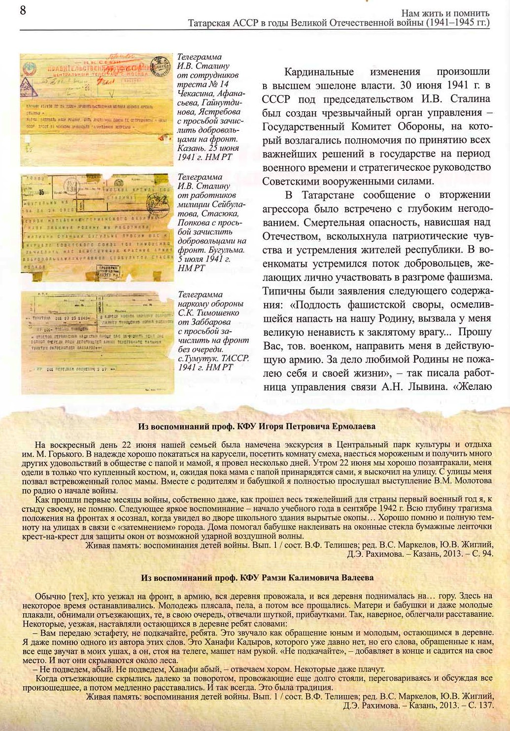 "Нам жить и помнить. Татарская АССР в годы Великой Отечественной войны (1941-1945 гг.)" - так назвали свой уникальный по содержательности труд сотрудники Института истории им. Ш.Марджани Академии Наук РТ - А.Ш. Кабирова, Е.Г. Кривоножкина и А.С. Бушуев.