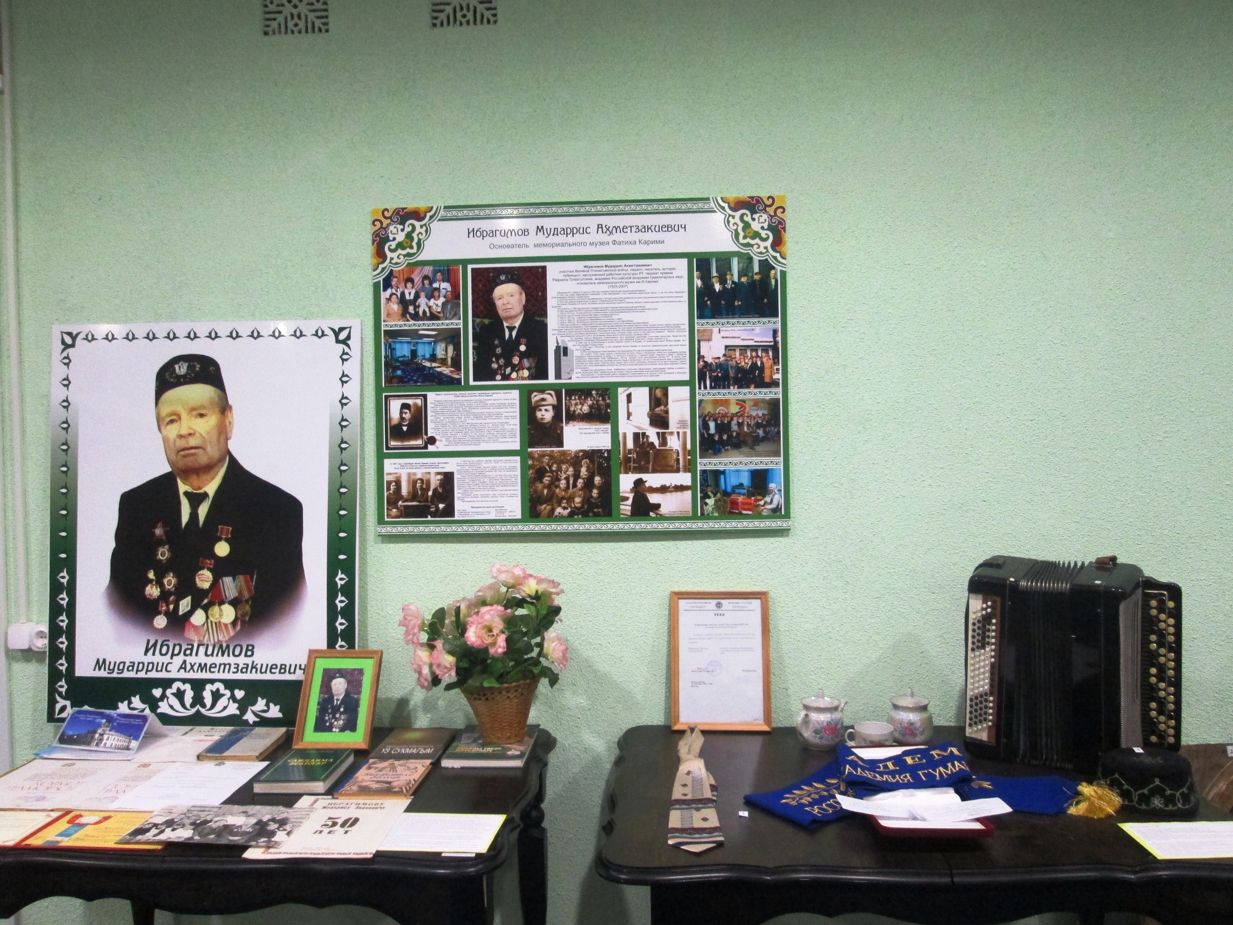 В Мемориальном музее Ф.Карими в с.Миннибаево открылась новая выставка «Гордость нашего села – Ибрагимов Мударрис Ахметзакиевич», которая посвящена участнику Великой Отечественной войны, педагогу, писателю, историку, публицисту, заслуженному работнику культуры РТ, лауреату премии Р.Тухватуллина, академику Российской академии гуманитарных наук, основателю мемориального музея им.Ф.Карими Ибрагимову Мударрису Ахметзакиевичу(17.08.1925-19.08.2007гг). На выставке представлены следующие экспонаты Ибрагимова М.А.: гармонь, печатная машинка, именной галстук и тюбетейка, почётная лента «Академик Российской академии гуманитарных наук», указ президента Шаймиева М.Ш. о присвоении почетного звания «Заслуженный работник культуры Республики Татарстан», книги автора: «Уз сукмагым», «Сайланма әсәрләр», «Гыйбрәтле гомер», документы, принадлежащие Ибрагимову Мударису.