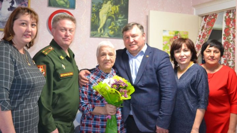 Большую честь оказали ветерану руководители, посетив ее в этот день целой делегацией. Глава района Макаров Валерий Владимирович, руководитель аппарата Совета района Закирова Резида Амировна, военный комиссар Галеев Ильгиз Наилевич, начальник отдела соцзащиты Зарипова Альмира Тахировна, руководитель клиентской службы Пенсионного фонда Бакасова Зульфия Шамильевна, начальник отдела надомного обслуживания Тазеева Гульшат Фаритовна тепло поприветствовали Валентину Александровну, пожелали ей всегда оставаться такой же оптимисткой.