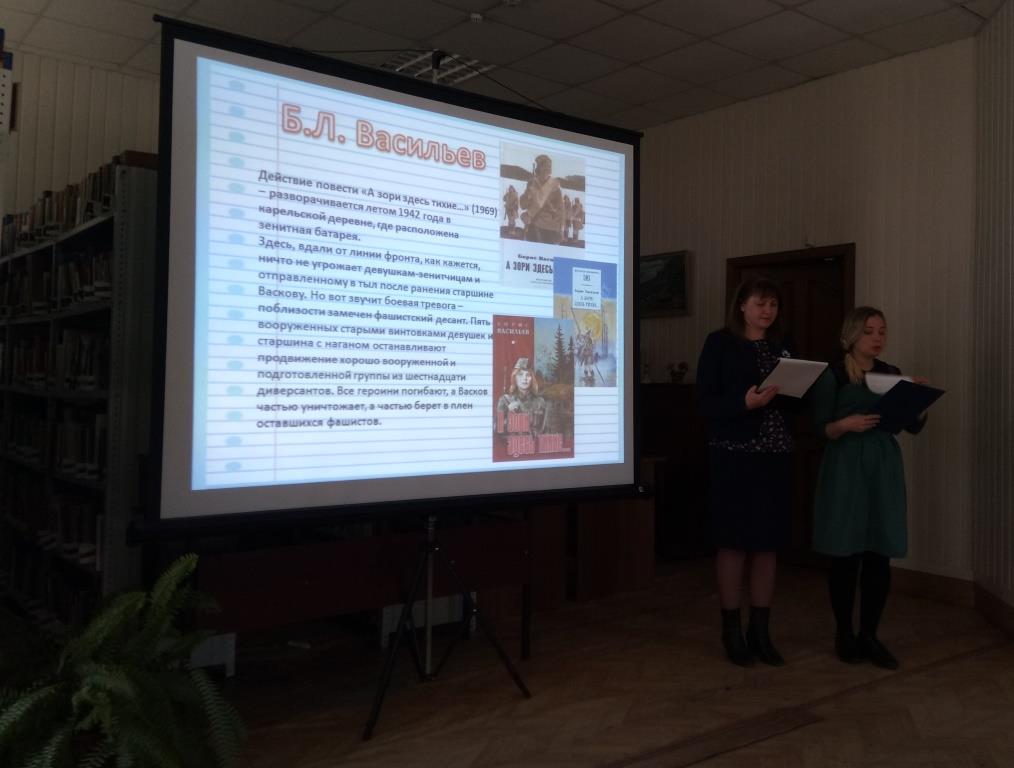 Ведущие мероприятия Светлана Сасаева и Евгения Кириллова рассказали о книгах, написанных писателями, которые прошли по опасным тропам войны. Это Б. Васильев «А зори здесь тихие», А. Толстой «Русский характер», В. Богомолов «Иван», В. Быков «Обелиск», Э. Казакевич «Звезда», А. Адамович «Хатынская повесть» и многие другие. Они сумели донести до читателей весь трагизм войны, который довелось пережить нашей стране в то страшное время.