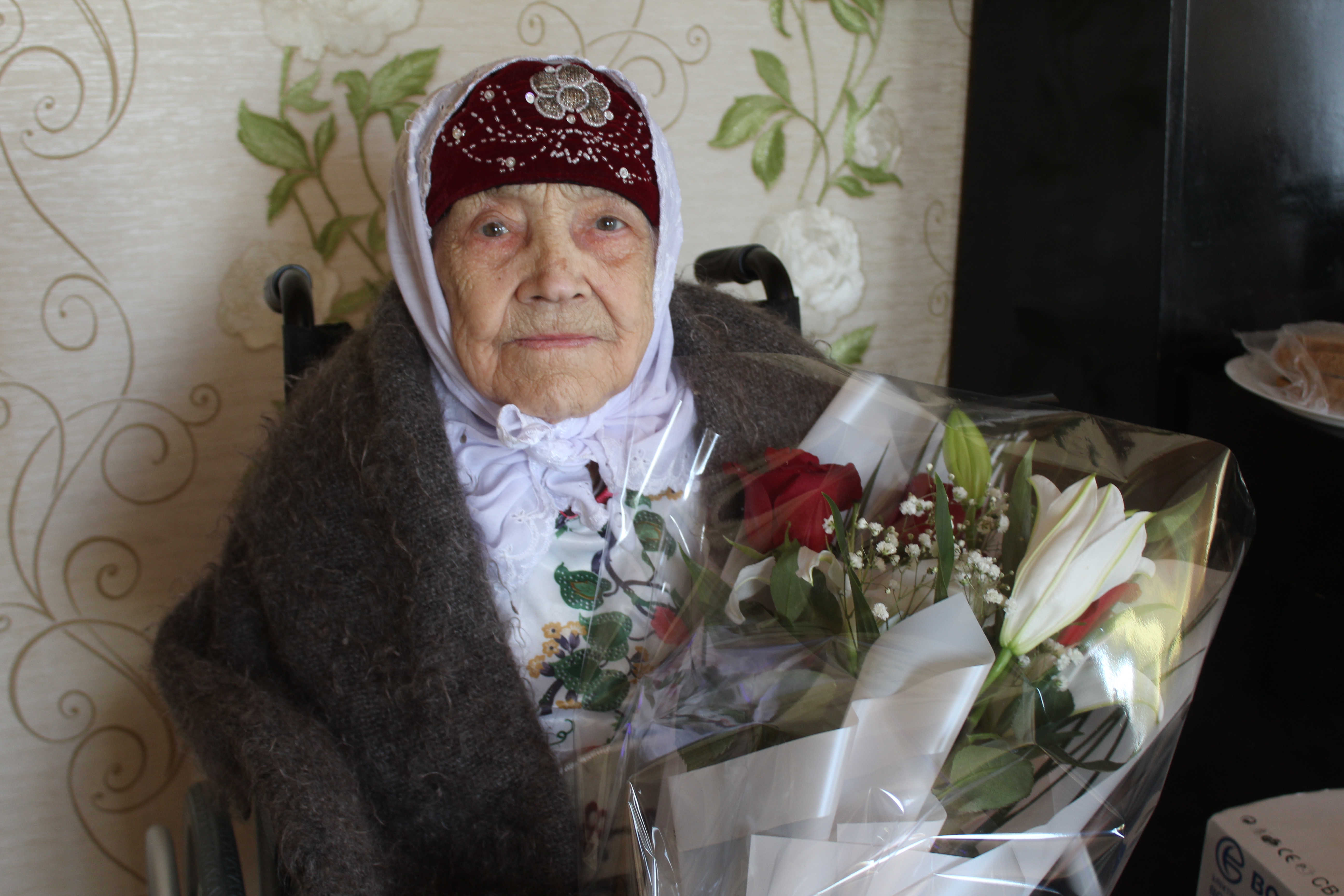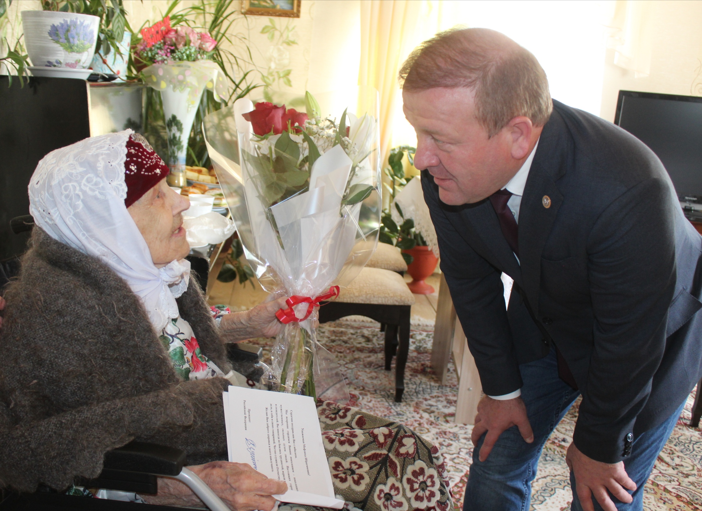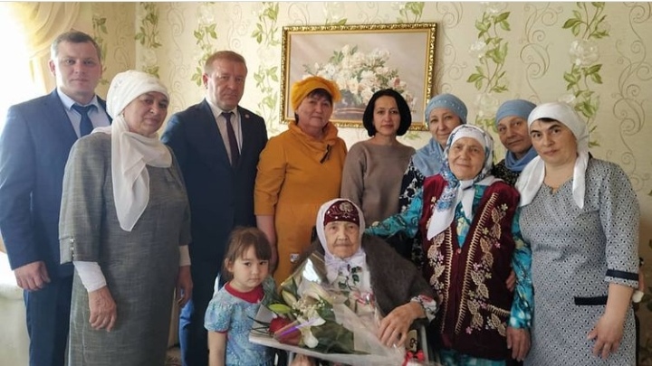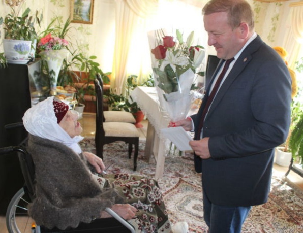Марат Гафаров высказал искренние поздравления, пожелал здоровья, ярких и счастливых дней. Вручил Мефлихе апа поздравительную открытку Президента РФ, подарок и цветы.