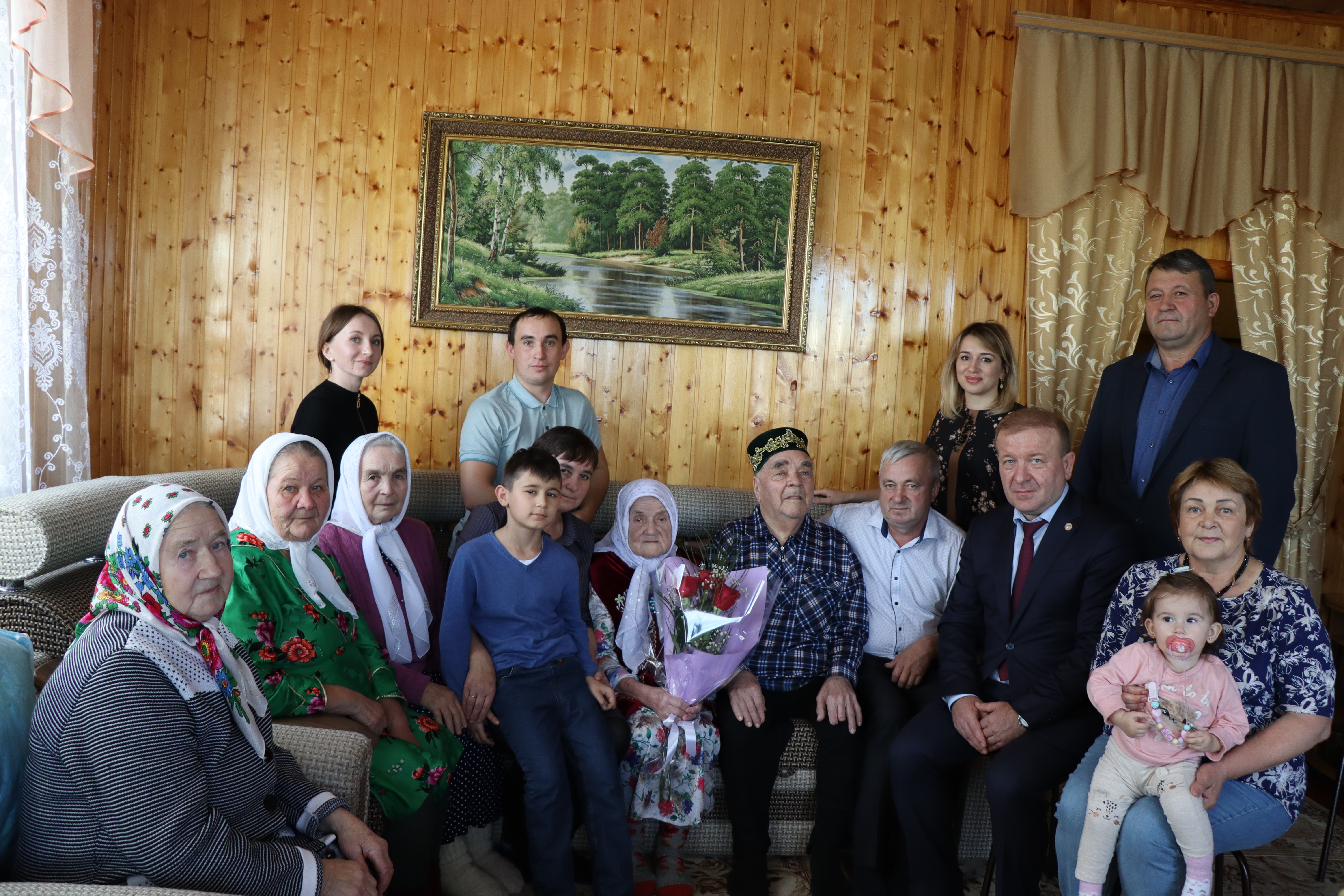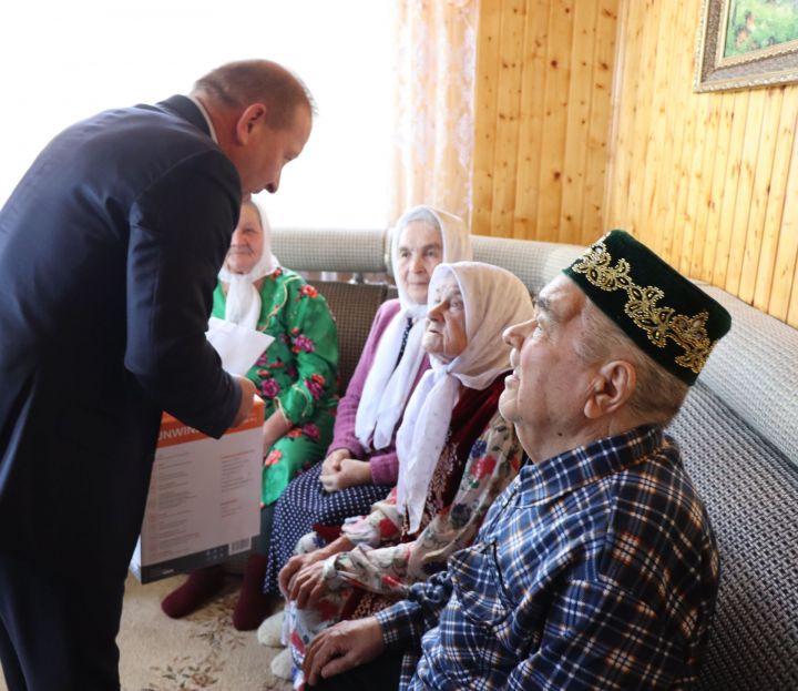 Марат Гафаров вручил поздравительную открытку, направленный Гульфие Шагиахметовне по случаю юбилея Президентом России В.В.Путиным и вручили юбиляру цветы и подарки.