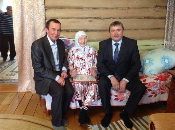 Поздравить ее с таким замечательным праздником приехали заместитель главы района Рашит Билалов и глава Нижнеалькеевского сельского поселения Мансур Галиуллин. Юбилярше вручили поздравительное письмо от Президента Российской Федерации В.В.Путина и главы района А.Ф.Никошина. Пожелали уважаемому ветерану крепкого здоровья, долголетия и вручили памятный подарок.