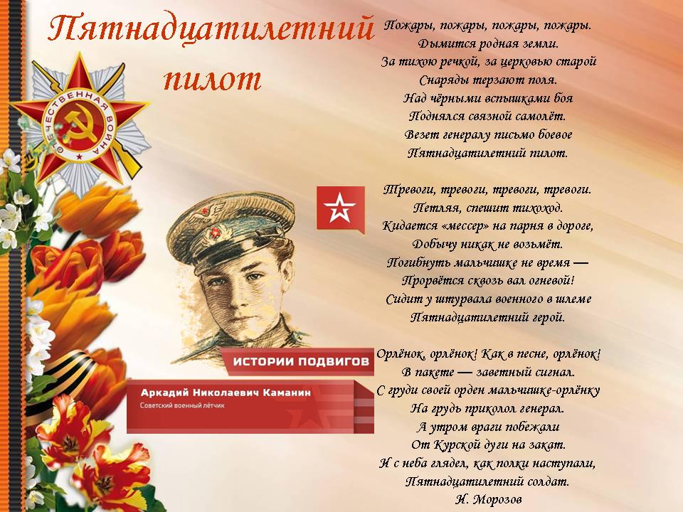 После этого Аркадию разрешили всерьез учиться летному делу. Он начал летать самостоятельно. Однажды с высоты юный пилот увидел наш самолёт, подбитый фашистами. Под сильнейшим миномётным огнем Аркадий приземлился, перенёс лётчика в свой самолёт, поднялся в воздух и вернулся к своим. На его груди засиял орден Красной Звезды. До самой победы сражался Аркадий Каманин с фашистами. Юный герой мечтал о небе и небо покорил.