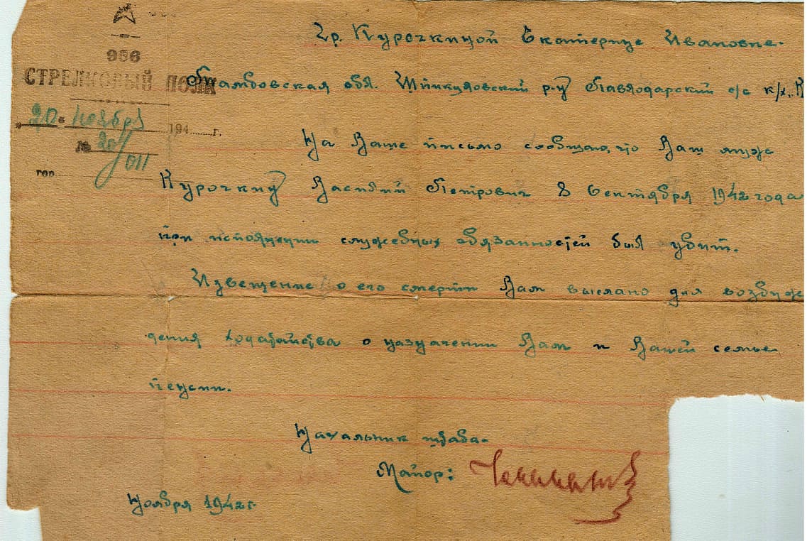 Радостную весть о том, что найдена внучка В.П.Курочкина, нам сообщила командир отряда «ТАТНЕФТЬ-ПОИСК» Миляуша Муллахметовна Котенкова. С помощью своих товарищей - волонтеров, Миляуше Муллахметовне удалось найти номер телефона внучки солдата, Беловой Антонины Николаевны. Позвонив ей, мы проговорили целый час. Для нее стало большой радостью известие о нашей находке. Все эти годы в ее семье бережно хранили память о деде. У Василия Петровича было пятеро детей: две дочери и три сына. Старшие: Петр Васильевич и Мария Васильевна, воевали на фронтах Великой Отечественной войны. А Мария в августе 1945 года, после Победы над Германией, участвовала в разгроме Японской армии на Дальнем Востоке. Василий Петрович был прекрасным отцом, любил рыбачить с сыновьями на местной речке.
