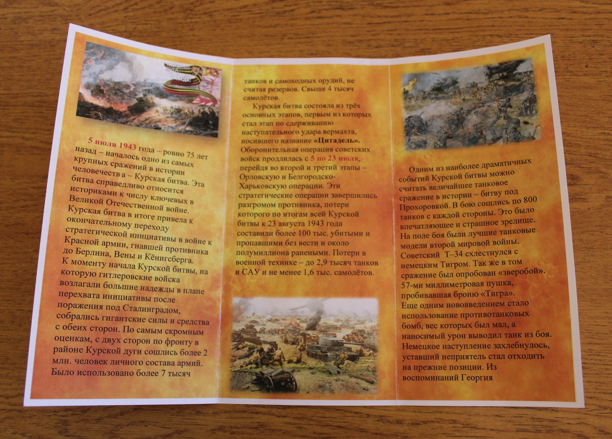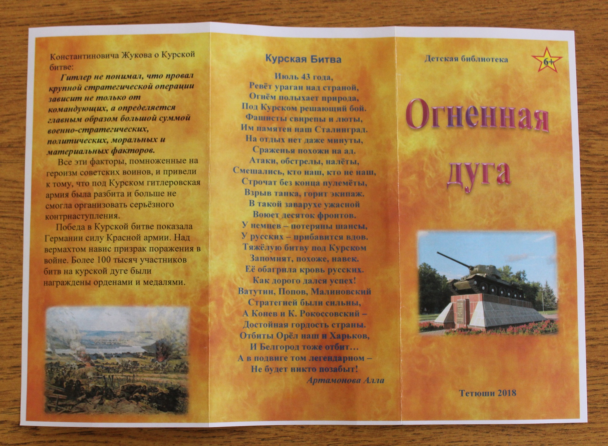 К этой знаменательной дате Детская библиотека подготовила буклет «Огненная дуга», в котором описываются события, происходившие на этом героическом рубеже 75 лет назад, и раскрываются имена героев, совершивших подвиги, защищая нашу Родину. Буклет был распространен среди детей, отдыхающих в центральном парке. Сотрудники библиотеки рассказали, почему в этот день в России отмечается День воинской славы. Ребятам были зачитаны отрывки из книг о Великой Отечественной войне таких известных писателей, как С. Алексеев, А. Митяев, А. Твардовский. Заинтересовавшись предложенной литературой, дети взяли ее для домашнего прочтения.
