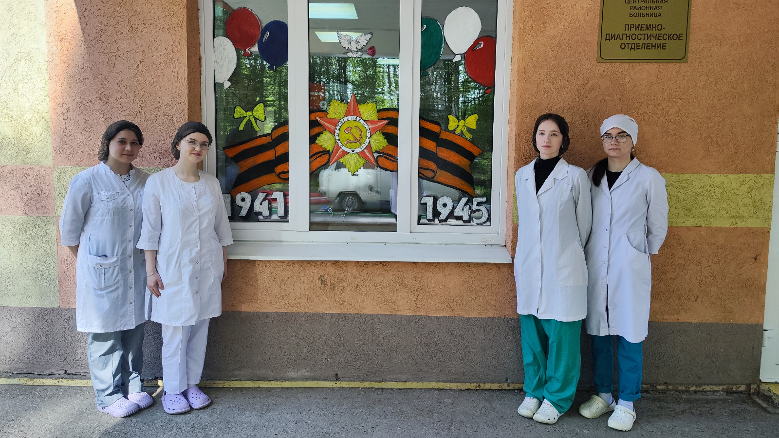 В преддверии Дня Победы в Великой Отечественной войне в холле поликлиник и стационаров Альметьевской ЦРБ размещены тематические материалы, посвященные празднованию Великой Победы. В рамках акции «Флаги Победы» на фасаде здания Поликлиники №1 вывешены знамена Победы. Сотрудники больницы принимают активное участие в акции «Георгиевская лента» - раздача георгиевских лент сотрудникам ЦРБ. Заменены аватары в социальных сетях Вконтакте, Одноклассники, Telegram на портрет Москалева Алексея Ивановича - заведующего-врача рентгенолога районной больницы, Героя, воевавшего в Великой Отечественной войне. В рамках акции «Окна Победы» оформлены и украшены окна в подразделениях ЦРБ, в т.ч. в палатах ветеранов, тематическими рисунками, трафаретами, символикой Дня Победы. В поддержку акция «Бессмертный автополк» размещена символика Великой Победы на автотранспорте больницы.