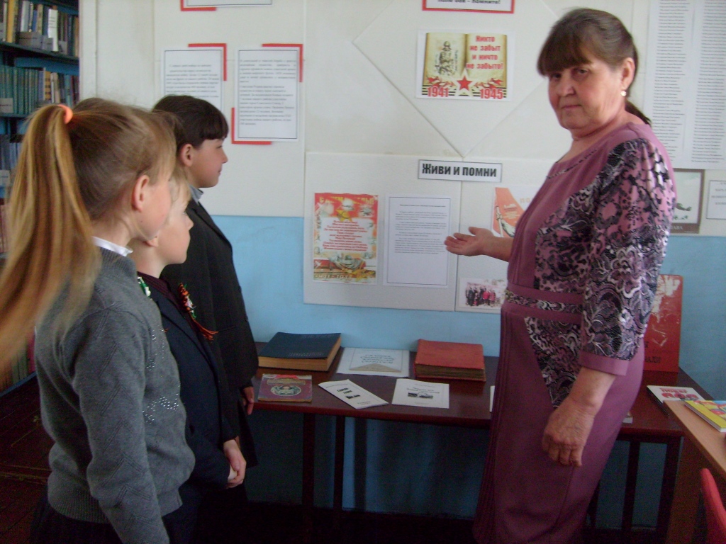 Во вступительной части мероприятия библиотекарь Валентина Роткина рассказала ребятам, какой огромной ценой потерь и лишений была завоевана Победа. Затем познакомила со стендом «Минувших лет святая память», где отражены сведения о наших земляках - участниках Великой Отечественной войны.