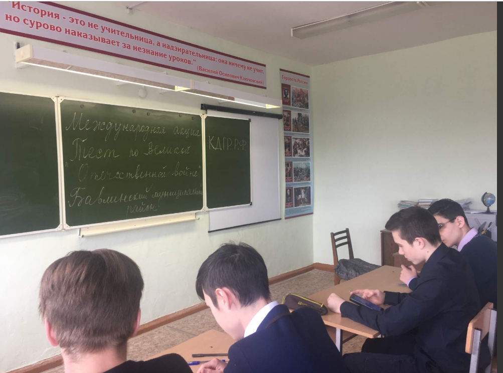 Бавлинский муниципальный район присоединился к Международной акции "Тест по Великой Отечественной войне. На базе МБОУ СОШ №6 26 апреля была организована площадка для тестирования. Приехали учителя и учащиеся из сел и городских школ. Координатор по району учитель истории МБОУ СОШ №6 Журавлева Валентина Николаевна приветствовала участников, подчеркнула актуальность этой акции и пожелала успехов в тестировании. Не столь важны баллы, сколь важно участие, которое дает возможность прикоснуться к славным страницам истории нашей страны.