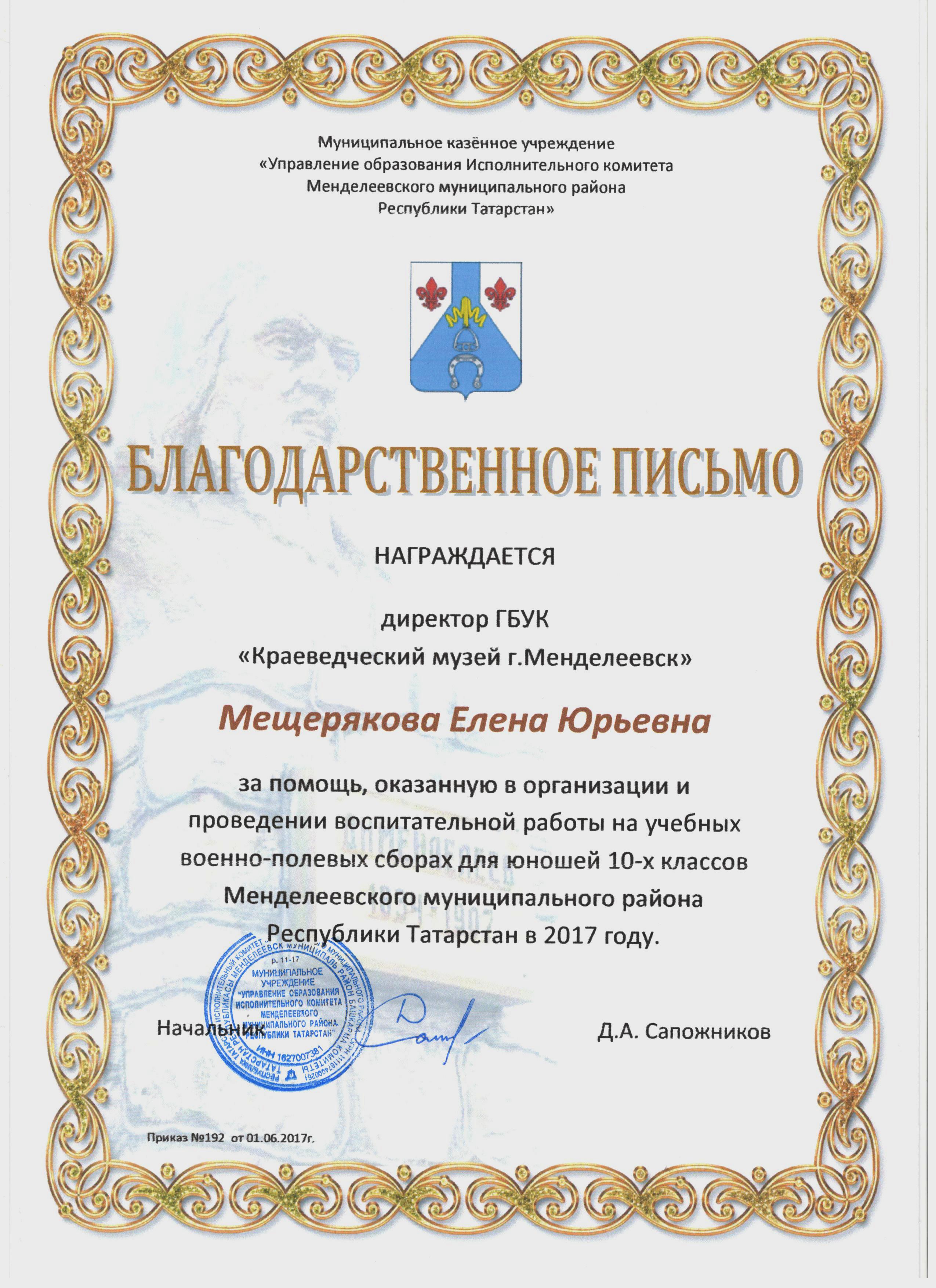Благодарственным письмом Управления образования награждена директор краеведческого музея Менделеевска Елена Мещерякова за помощь в организации и проведении воспитательной работы на военно-полевых сборах учащихся Менделеевского района.