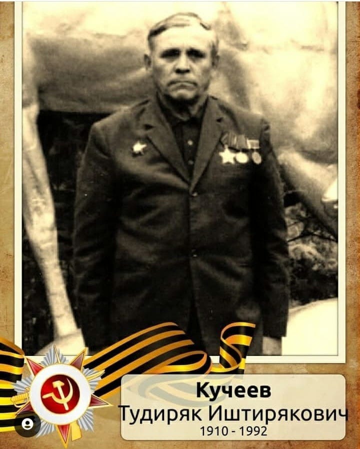 Мой прадедушка Кучеев Тудиряк Иштирякович родился 20 февраля 1910 г. в д. Клементейкино, Акташского р-н, Татарской АССР. В ряды Красной Армии призван в 1941 году.Акташским РВК Татарской АССР, Акташского р-на. Служил в составе 31 армии, 1 Украинского фронта. Был командиром отделения связи 2ой Минской роты. Он прошел боевой путь от Украины и до Германии. В наступательных боях на территории Восточной Пруссии показал себя отважным, смелым и решительным воином. За что был награжден «Орденом Красной Звезды» и «Орденом Славы 3 степени». Так же был награжден Орденом Отечественной войны II степени и Медалью «За победу над Германией в Великой Отечественной войне 1941–1945 гг.»
