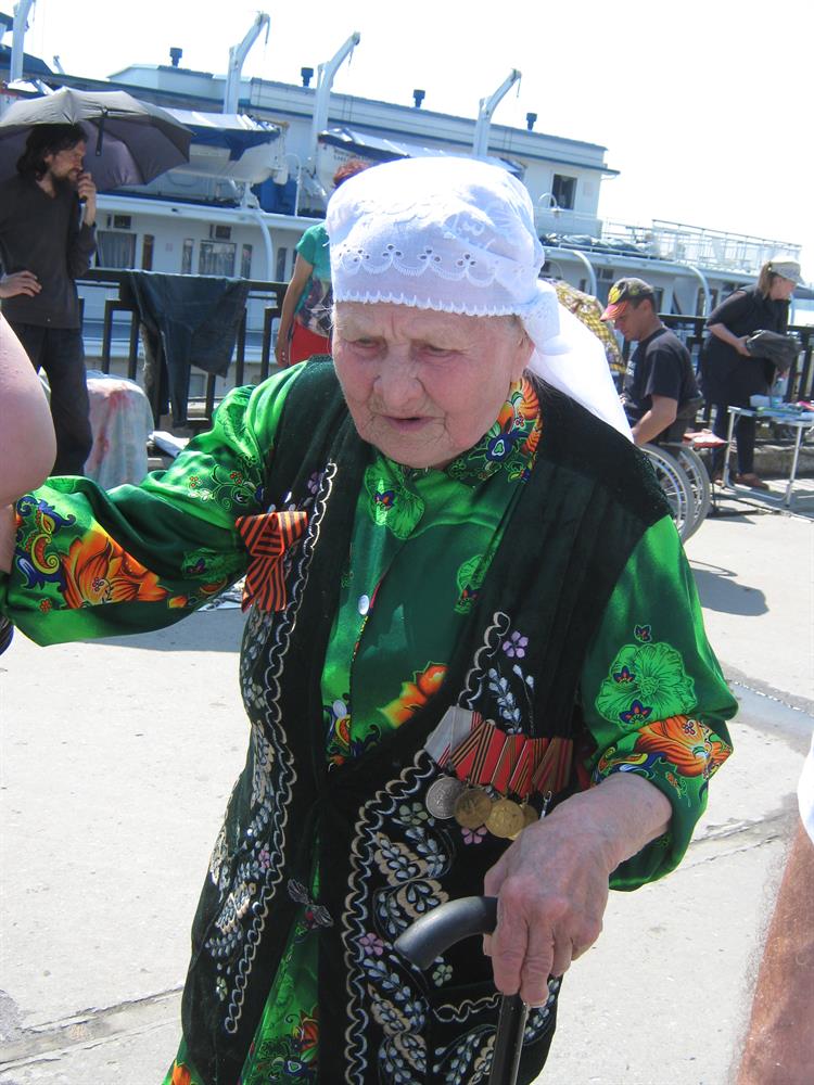 И невозможно не подняться на четвертую палубу нам, не знавшим всего этого, если поднимается чтобы рассказать о своей работе в колхозе во время войны 89-летняя Заббарова Муслима Валеевна. Она ходит с палочкой, ее сопровождает медсестра из буинского дома-интерната, где она сейчас проживает. Но она везде с нами, и на Мамаевом кургане, и на встречах и концертах.