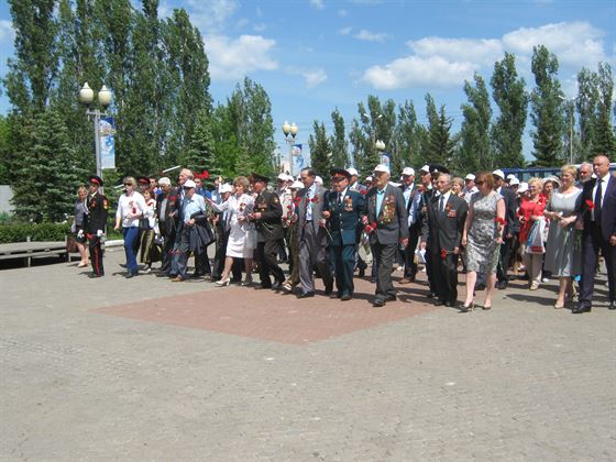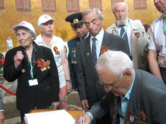 Митинг со встречающими нас в порту. Сначала мы едем по городу. После обзорной экскурсии – знаменитый Мамаев курган. Я третий раз в этом городе, знаю, как труден и долог путь к подножию монумента «Родина-мать» если идти от Волги. Но хорошо, что автобусы привезли нас на Мамаев курган с другой стороны гигантского монумента. Ведь среди нас трое участников Сталинградской битвы, самой старшей Любови Ивановне Козловой из Альметьевска 95 лет. Одному мужчине армянину Рубену Шахназарову – 89, Ковалеву Илье Абрамовичу – 92. да и другим ветеранам около 90 лет.