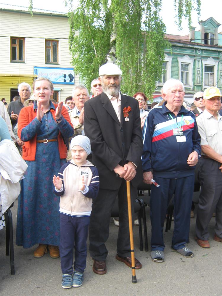 Жарко, уставшие, идем обратно к автобусам. Как выдерживают это наши ветераны! Единственному Герою Советского Союза, оставшемуся в живых в Татарстане 90 лет. Это известный всем казанцам Борис Кириллович Кузнецов. К счастью, задора у него на всех пока хватает, его речь открывает все наши митинги.