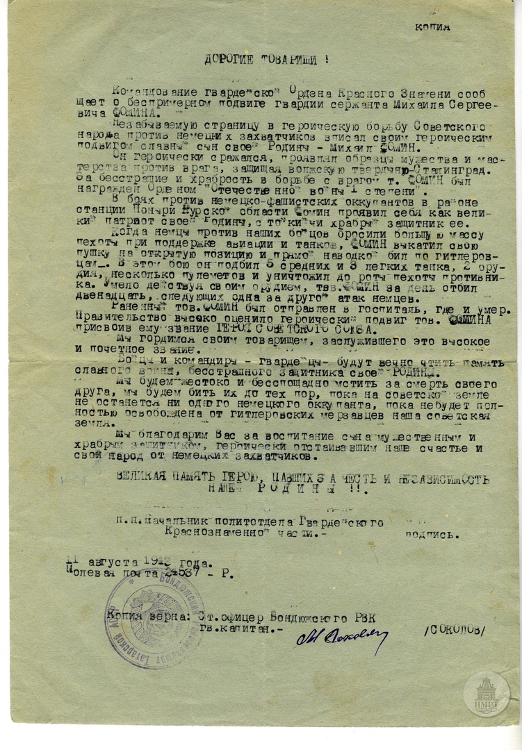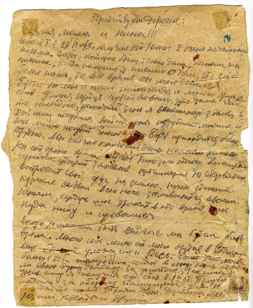 Скоро, а может быть сейчас мы будем бить врага. Много их легло от моего орудия в Сталинграде, еще больше уложу их и здесь. Было дело, когда больше 80-ти гитлеровских собак в один день отдавали свою душу дьяволу. За уничтожение техники и живой силы я получил орден Отечественной войны 1-ой ст. Получил медаль «За оборону Сталинграда». Дали гв.з(…). Передайте привет (Т..) Жене, Деревягиным, (М…), Юрам (?), Косте и другим.