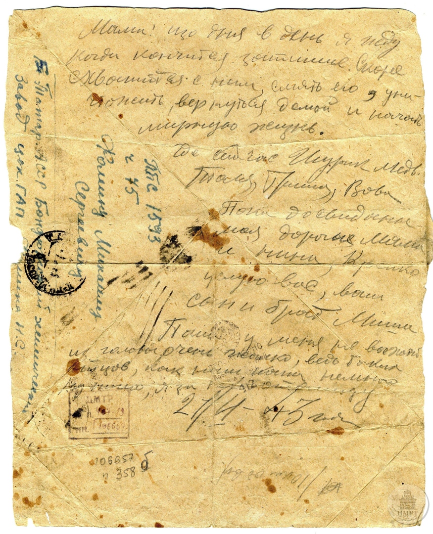 Где сейчас Шурик Медв., Толя, Гриша, Вова. Пока до свиданья, мои дорогие мама и Нина, крепко целую вас, ваш сын и брат Миша.