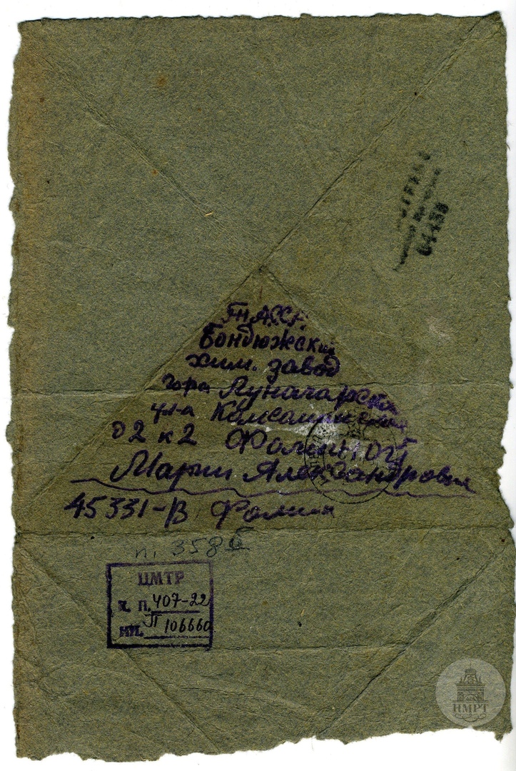 Здравствуйте, дорогая мама и Нина. Сегодня 30.VI/43 г. 17 месяцев, как я из дому, а кажется, что прошло лет 10. Нахожусь все еще здесь. Наша землянка очень светлая и вечером в этой землянке становится мрачно, сильная скука по дому, из головы не выходит папа. Да еще прилетит к землянке этот здешний, (слово вымарано) соловей. Как запоет, так словно колом по сердцу ударит. Выбежишь из землянки, спугнешь его и полетит он на Орел, да вернется, боится чорта - немца. Ведь тот не разбирая съест и соловья. Мама, увижу ли я тебя, папа не дождался, а ты терпи, не хворай, я скоро приеду, (...) скоро (...). Передавайте привет товарищам и соседям. До свидания (подпись)