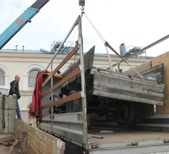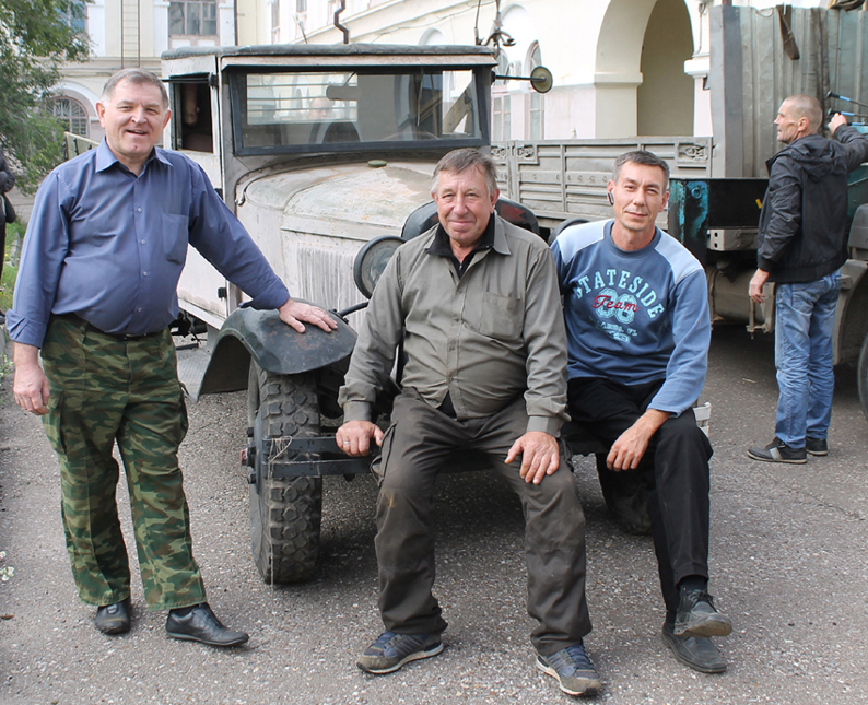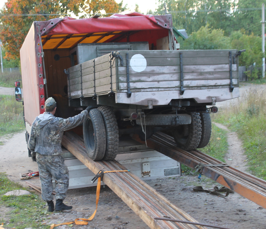 Благодаря опыту военного водителя Владимира Сергеевича Малыгина и смекалке Михаила Черепанова удалось втроем с лужским поисковиком Сергеем и водителем Владимиром практически вручную закатить по доскам полуторку в кузов.