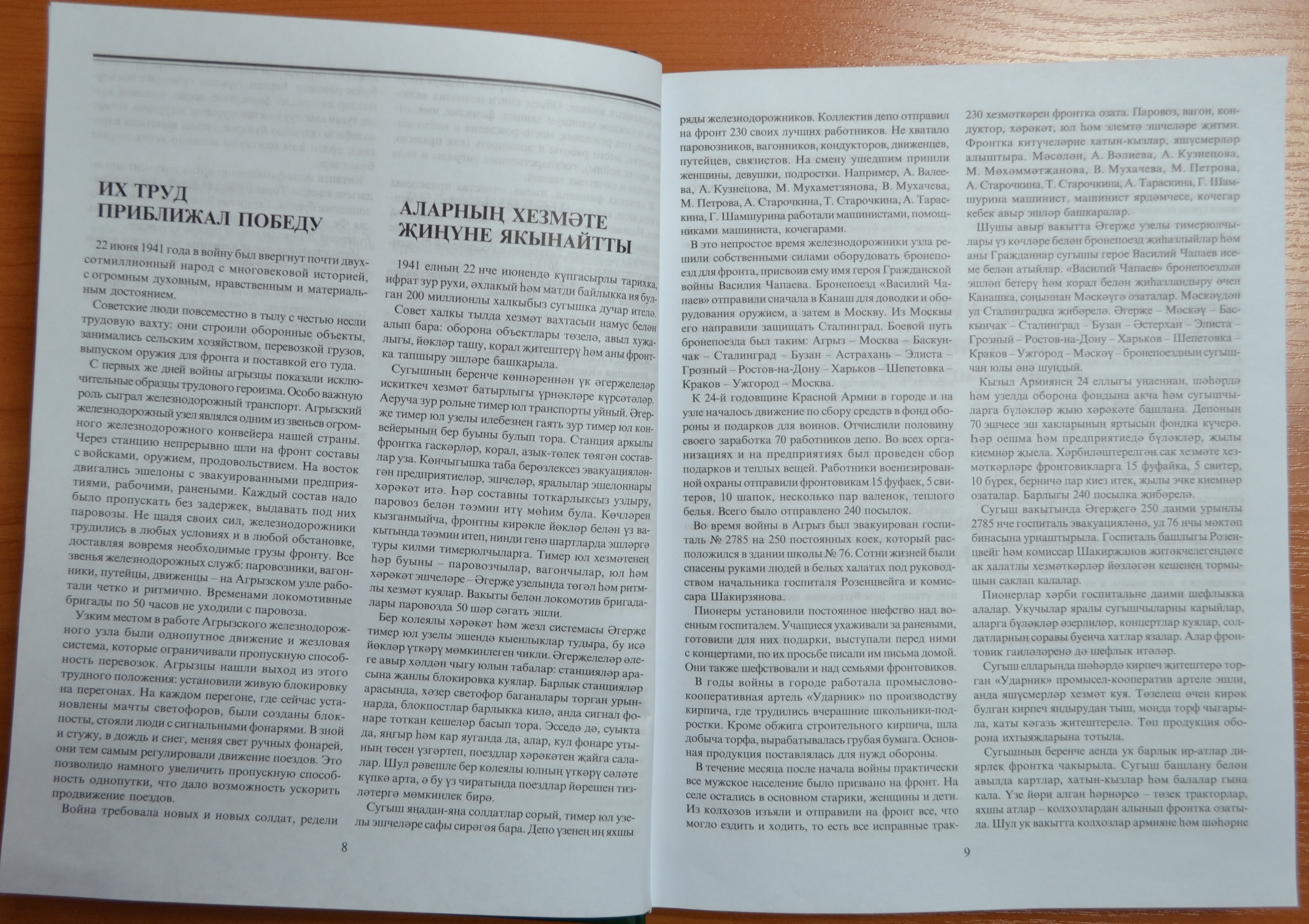 На 8 странице книги есть статья главы Агрызского муниципального района Республики Татарстан Макарова Валерия Владимировича «Их труд приближал Победу», в которой говорится о вкладе Агрызского района в победу в Великой Отечественной войне.