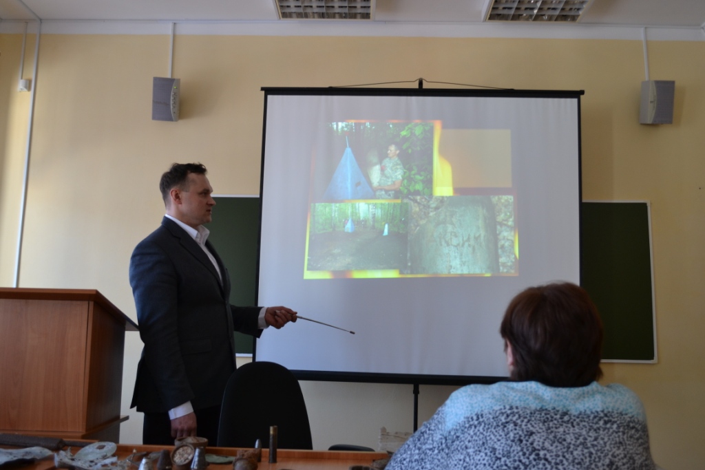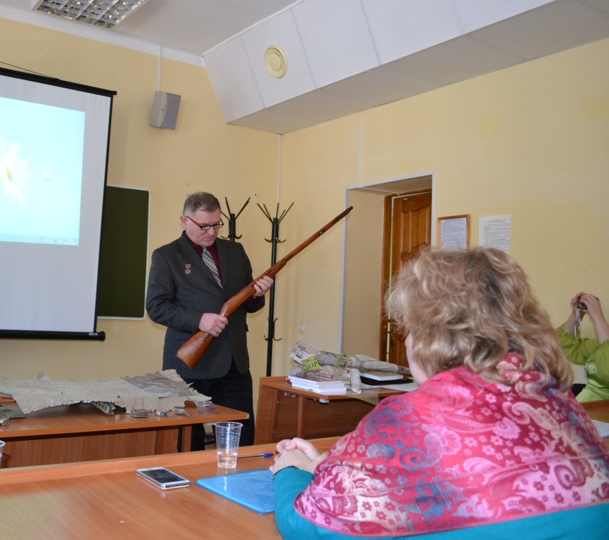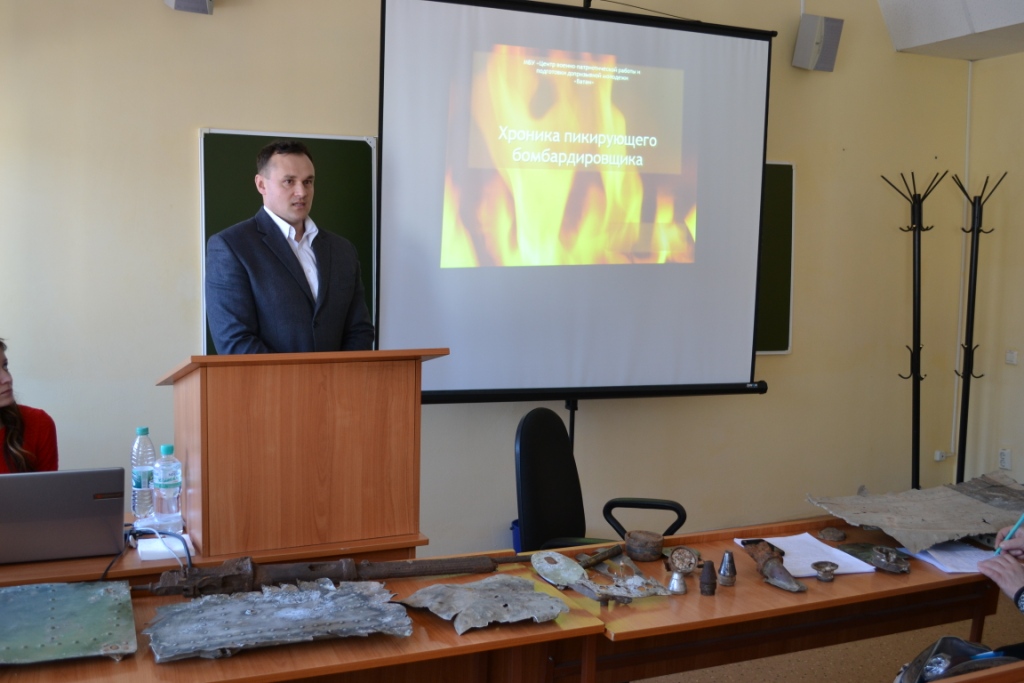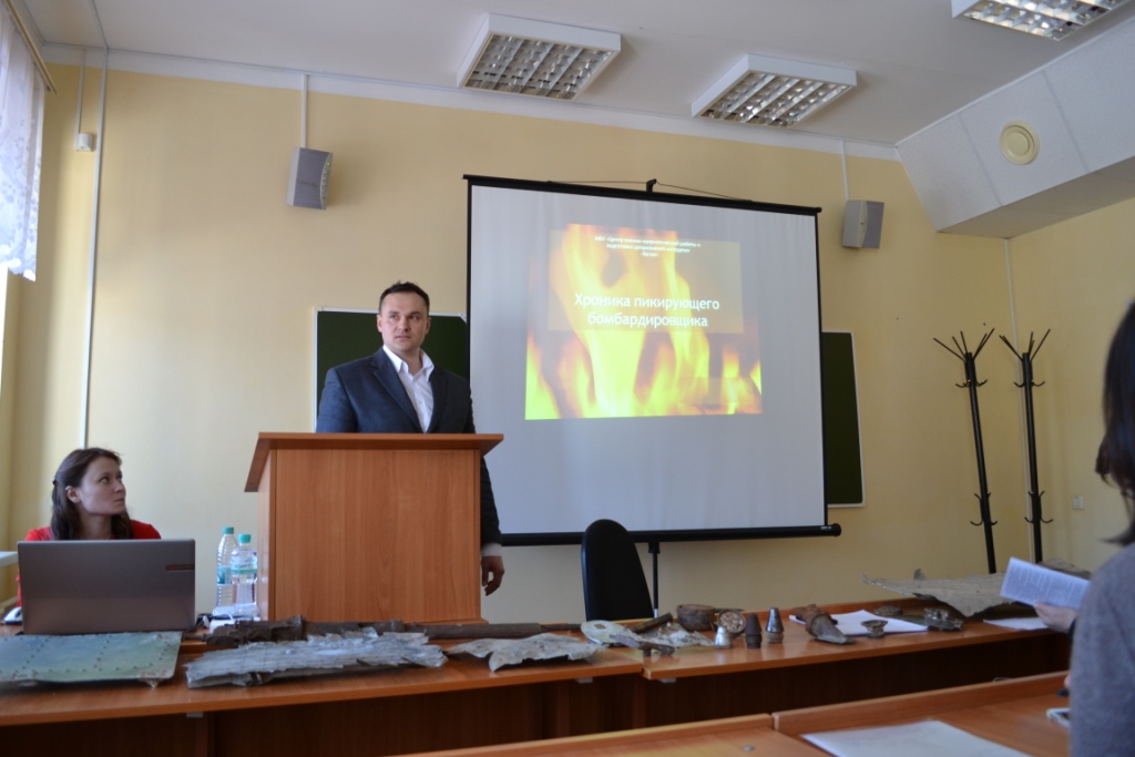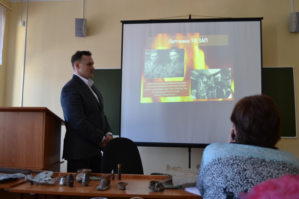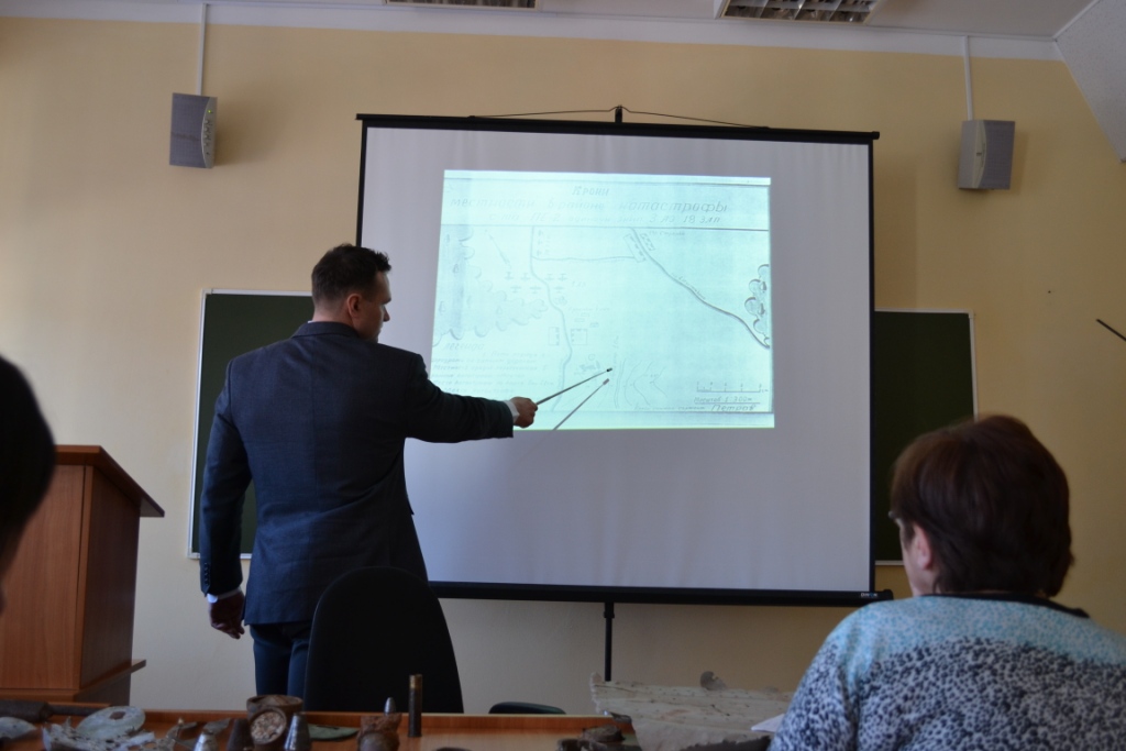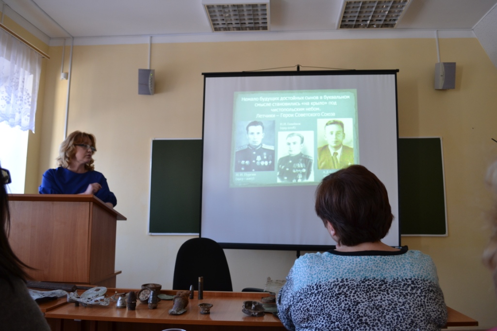 Юдин Дмитрий Владимирович коснулся истории г. Чистополя в годы войны и в частности темы базирования в его окрестностях 18 запасного авиационного полка, презентовал собственные полевые поисковые изыскания.