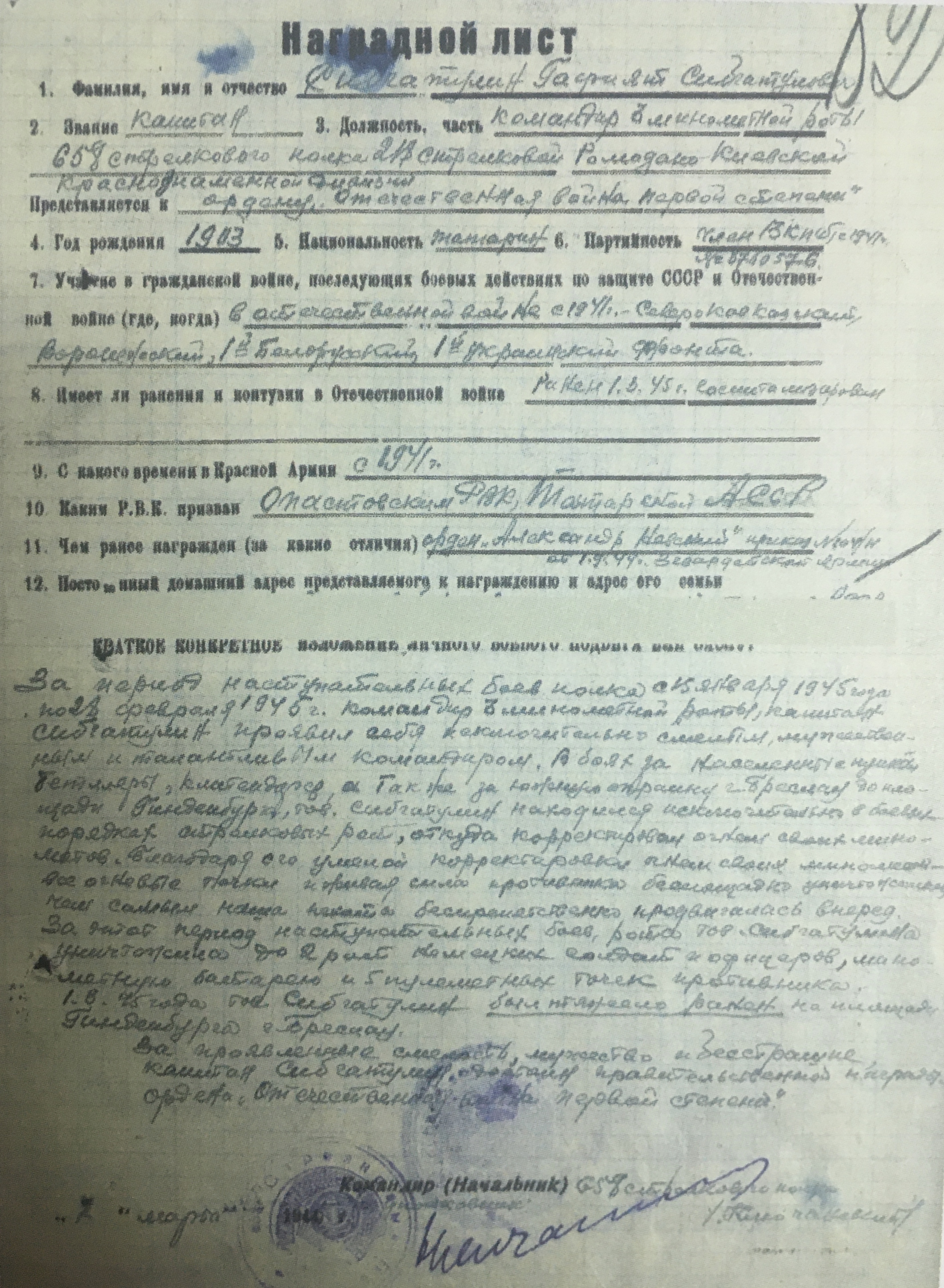 На сегодняшний день ситуация проще. Нужно лишь иметь доступ в интернет и желание поиска. Начав с установления личности Мирсаете Саубанова, я нашел ссылку на книгу Памяти Татарстана (old.v-ipc.ru>docs/kp_rt.asp), где он фигурирует как красноармеец, пропавший без вести. Но его учли, а значит, помнят и это ценно. Оставил на сайте электронный запрос с описанием тех крупиц информации, которые я знаю. Поисковиками ведется очень большая работа, много еще документов не обработано и не рассекречено. Но надежда есть. Также мне удалось найти подлинники наградного документа прадеда по маминой линии, вернувшегося с войны, Гафията Сибгатуллина.