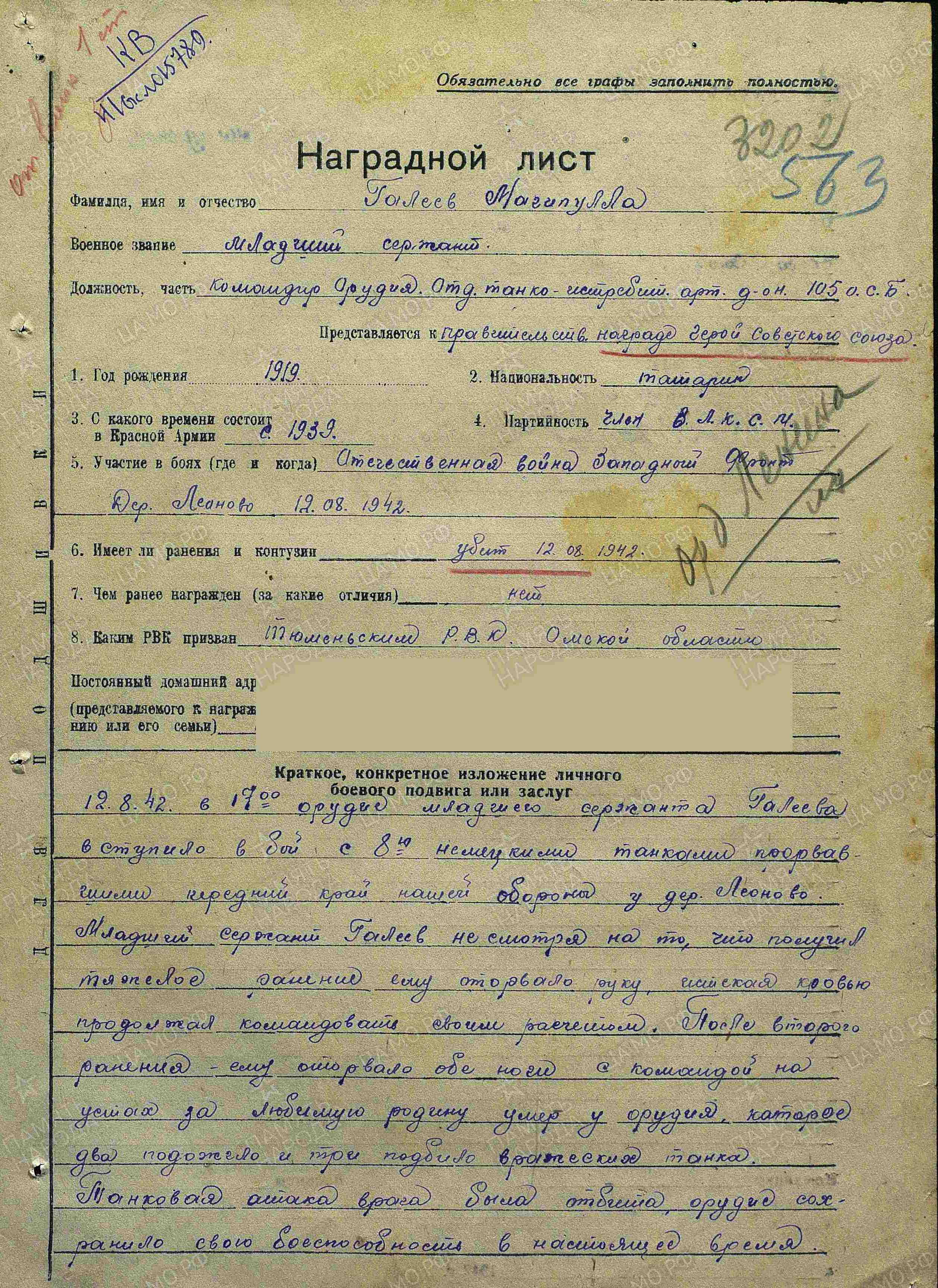 ГАЛЕЕВ Магилулла, 1919 г.рожд. из г.Тюмени, младший сержант, командир орудия истребительно-противотанкового дивизиона (посмертно награжден орденом Ленина);