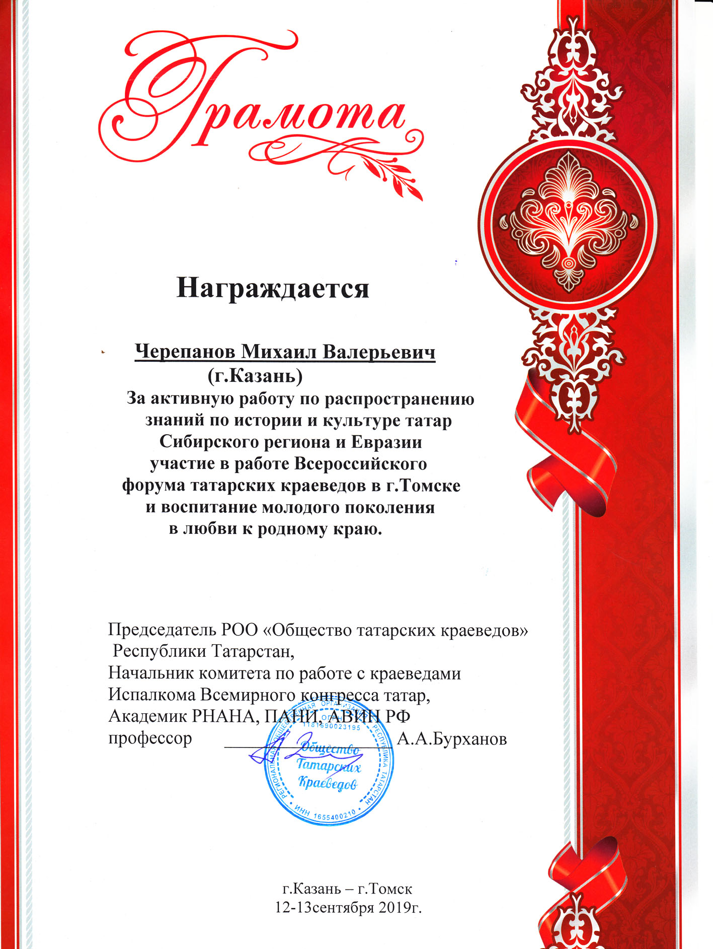 С докладом "Подвиг сибирских татар на фронтах Великой Отечественной войны" Черепанов выступил на Всероссийском форуме татарских краеведов в Томске 12 сентября 2019 г.