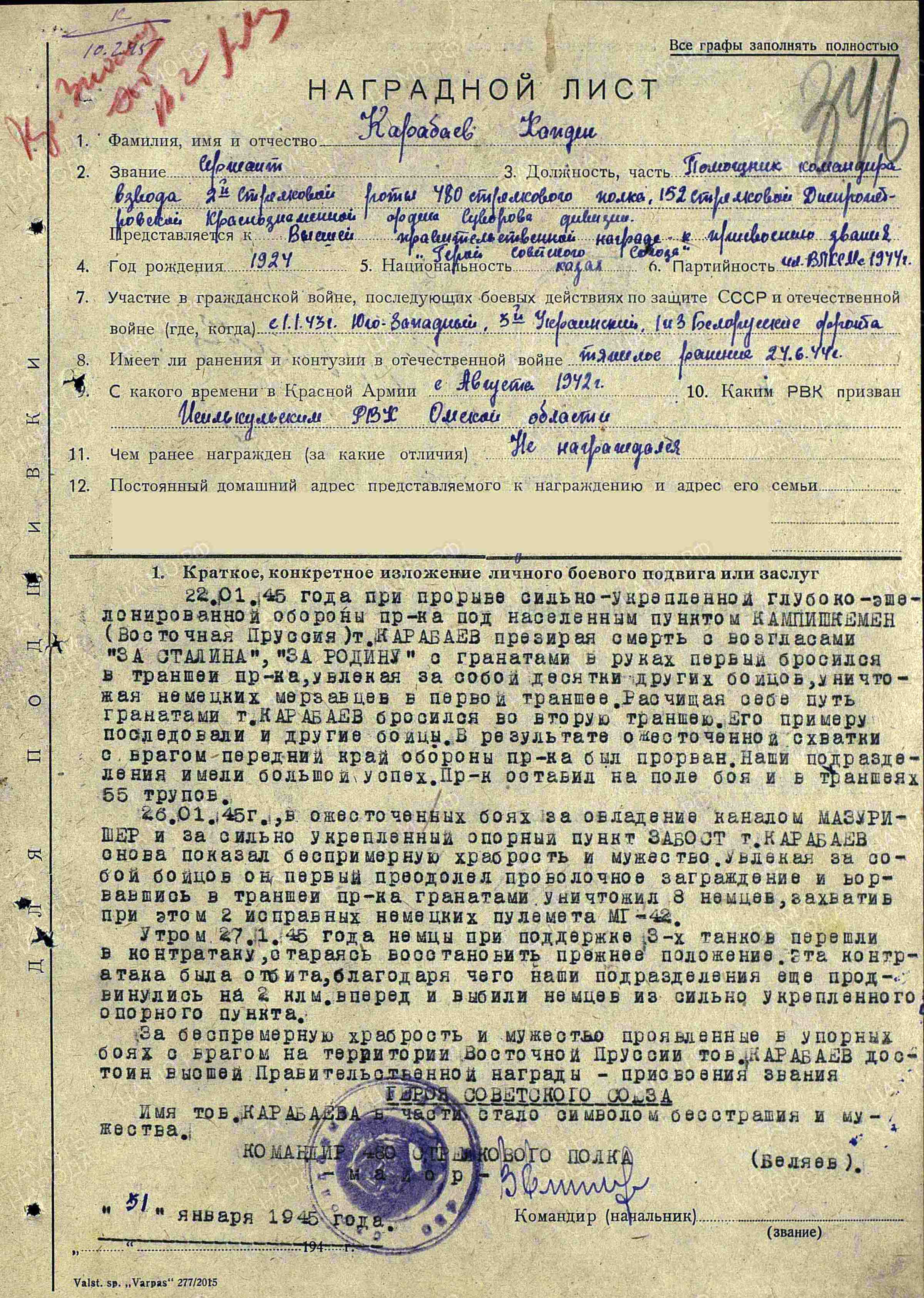 КАРАБАЕВ Канден, 1924 г.рожд., мобилизован Иссык-Кульским РВК Омской обл., сержант 152 стрелковой дивизии (после тяжелого ранения награжден орденом Красного Знамени);
