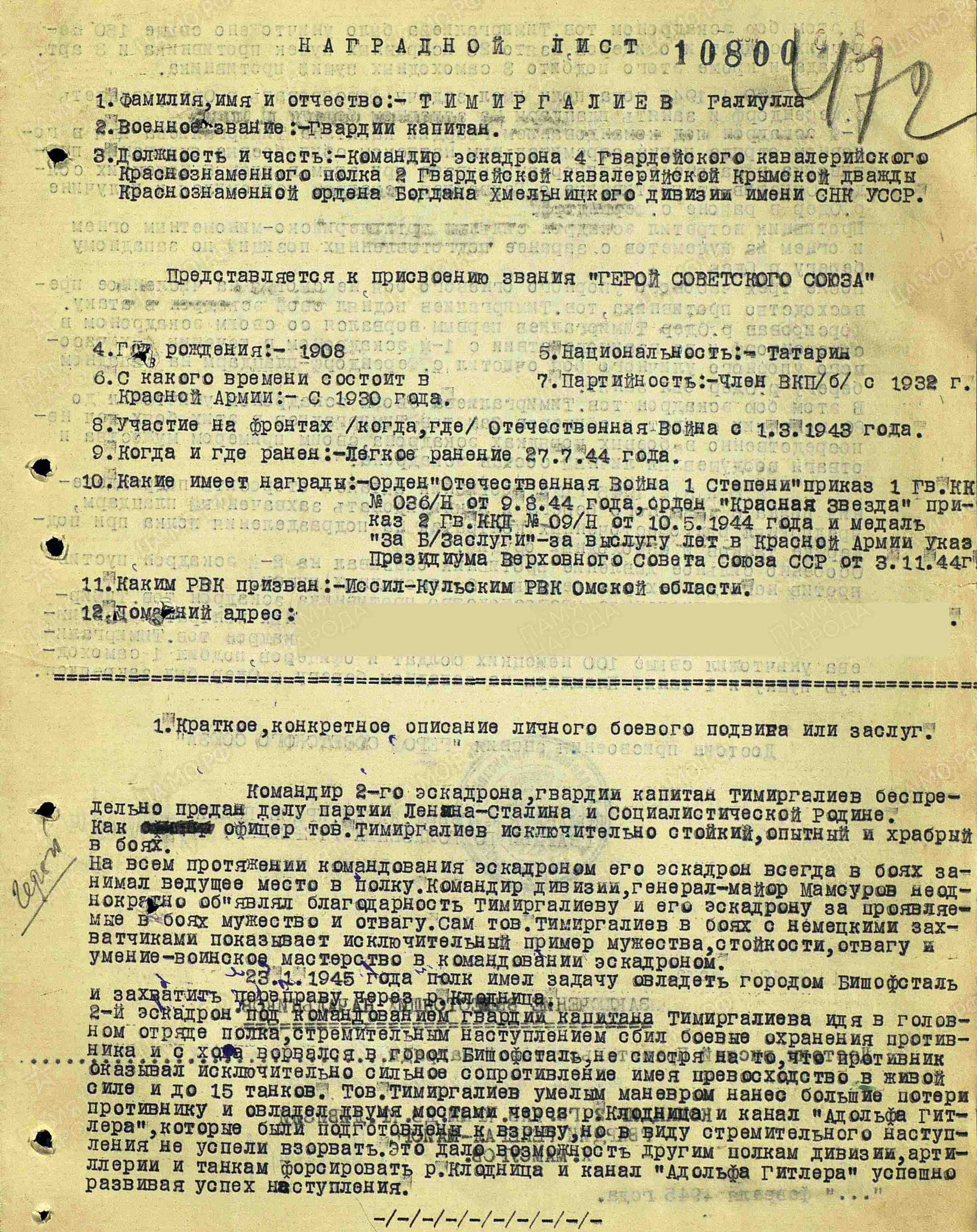 ТИМИРГАЛИЕВ Галиулла, 1908 г. рожд., мобилизован Иссык-Кульским РВК Омской области, гвардии капитан, командир эскадрона 2 гвардейской кавалерийской Крымской дивизии (награжден орденом Красного Знамени);