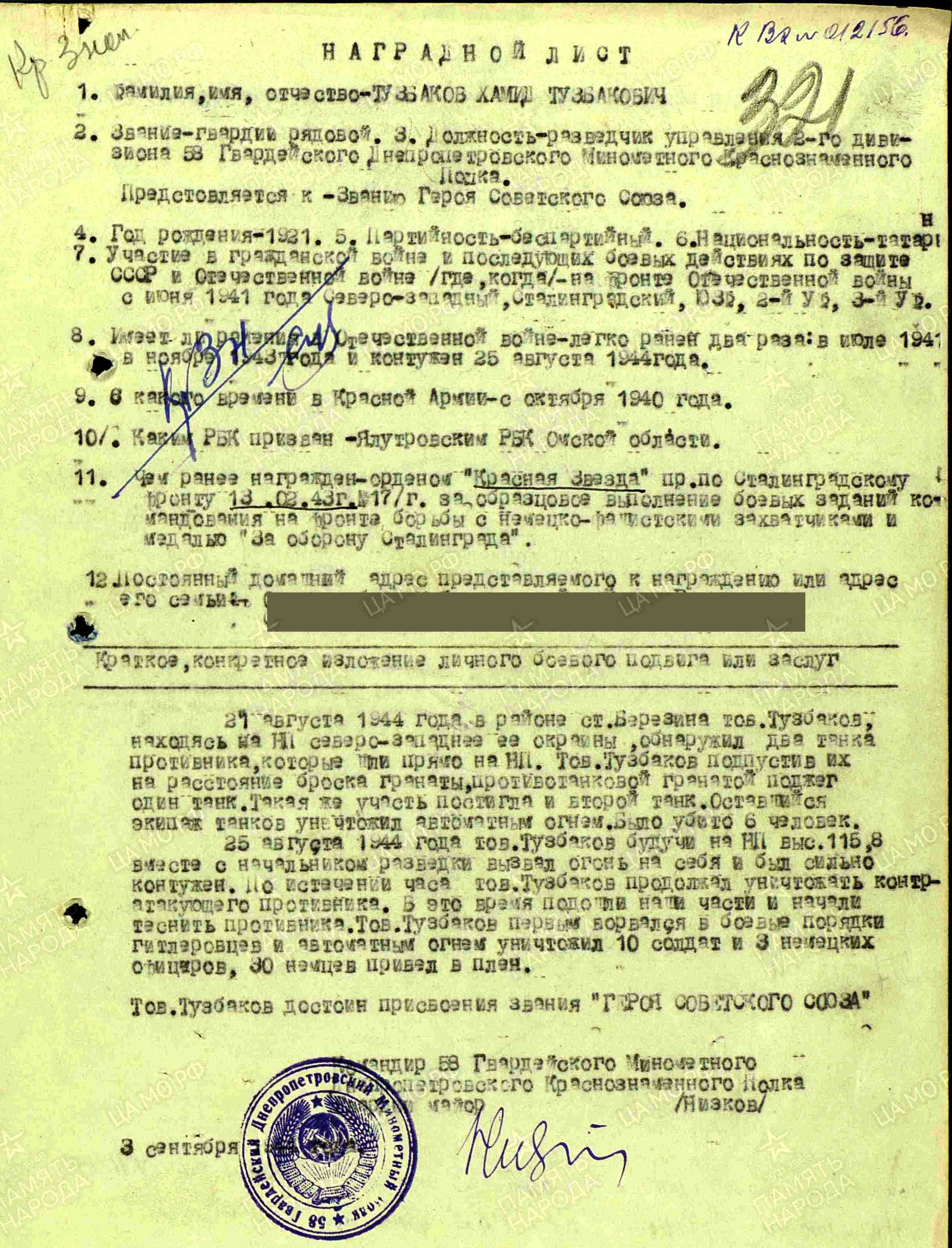 ТУЗБАКОВ Хамид Тузбакович, 1921 г. рожд, мобилизован Ялуторовским РВК Тюменской области. Разведчик 58 гвардейского минометного полка (награжден орденом Красного Знамени);