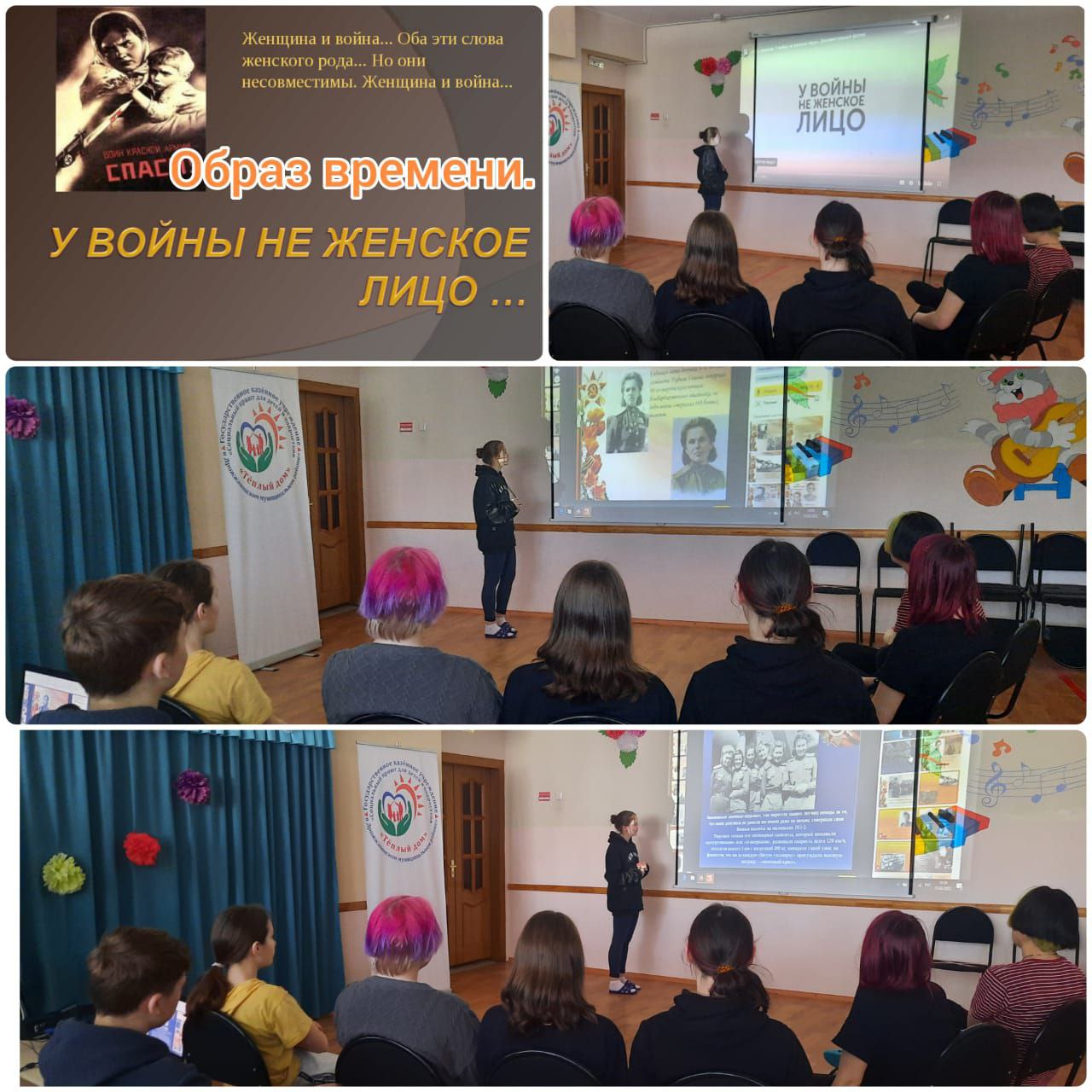 В социальном приюте "Тёплый дом" с целью продемонстрировать, какой вклад внесли женщины для победы в Великой Отечественной войне, развить способность сопереживать, сочувствовать, воспитать чувство патриотизма, гордости за наш народ и благодарности к нашим ветеранам детьми была просмотрена презентация "Образ времени. У войны не женское лицо"